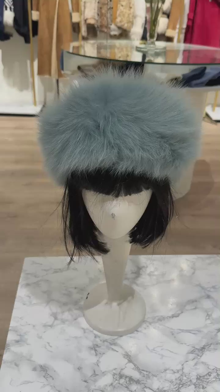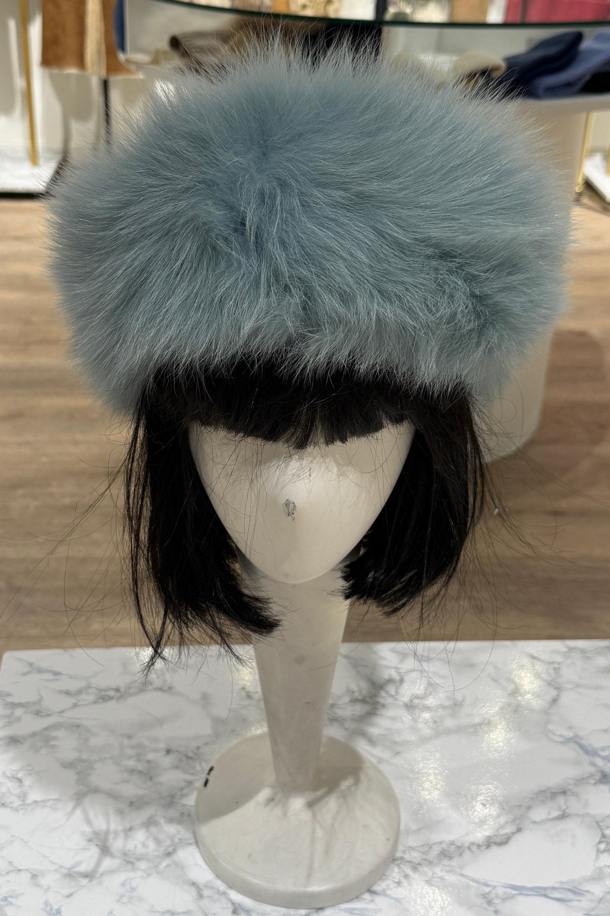 Blue wool and cashmere blend hat with fox fur trim. Soft, smooth, close-fitting crown. Comfortable fit.