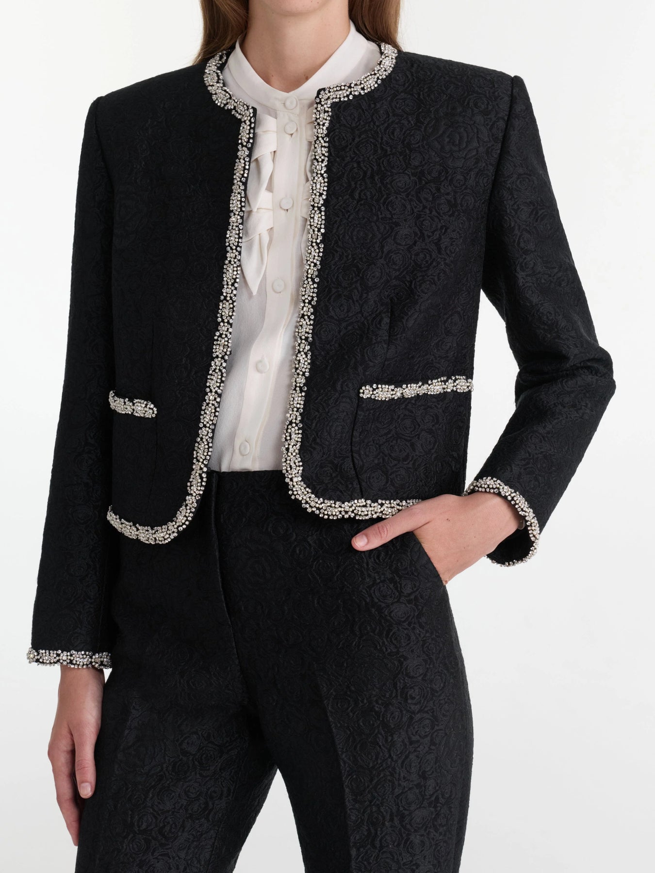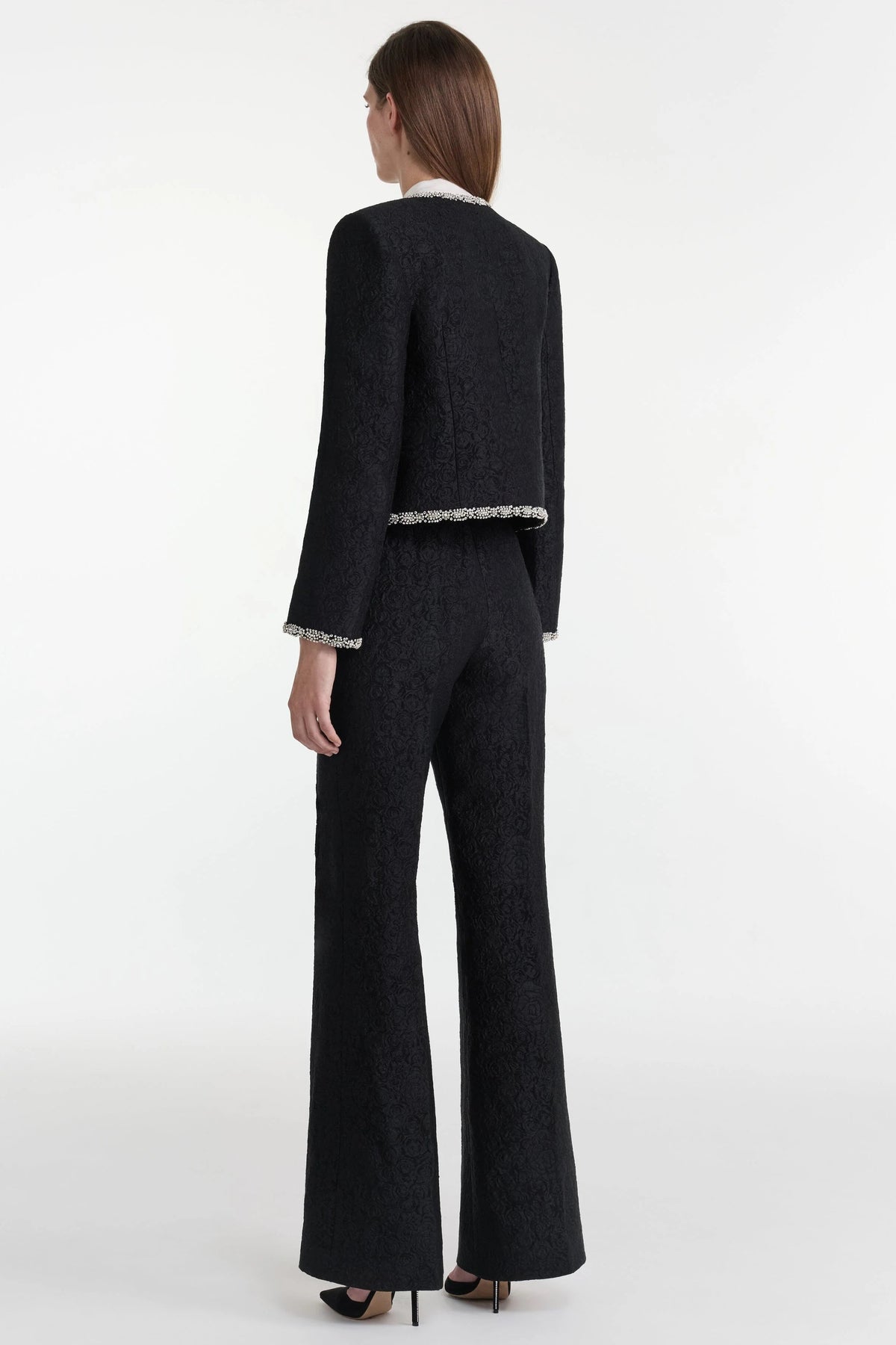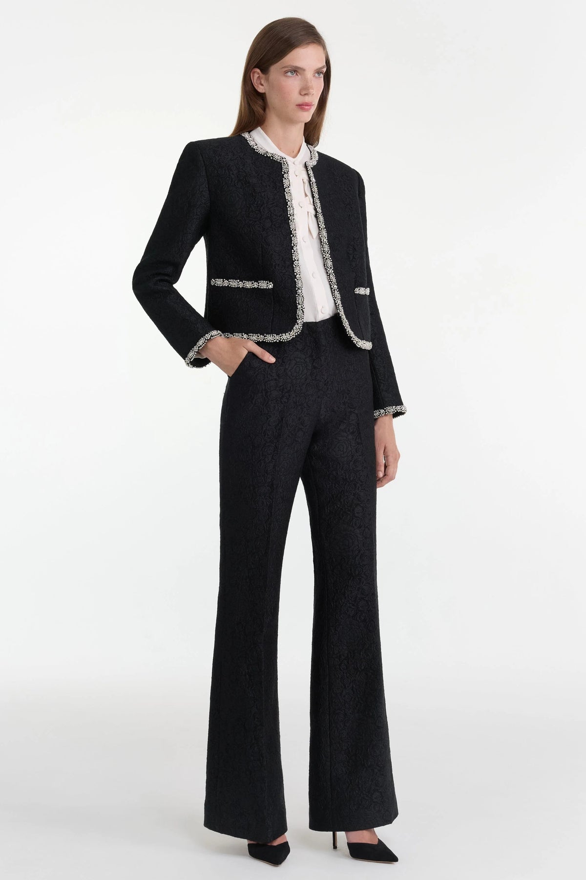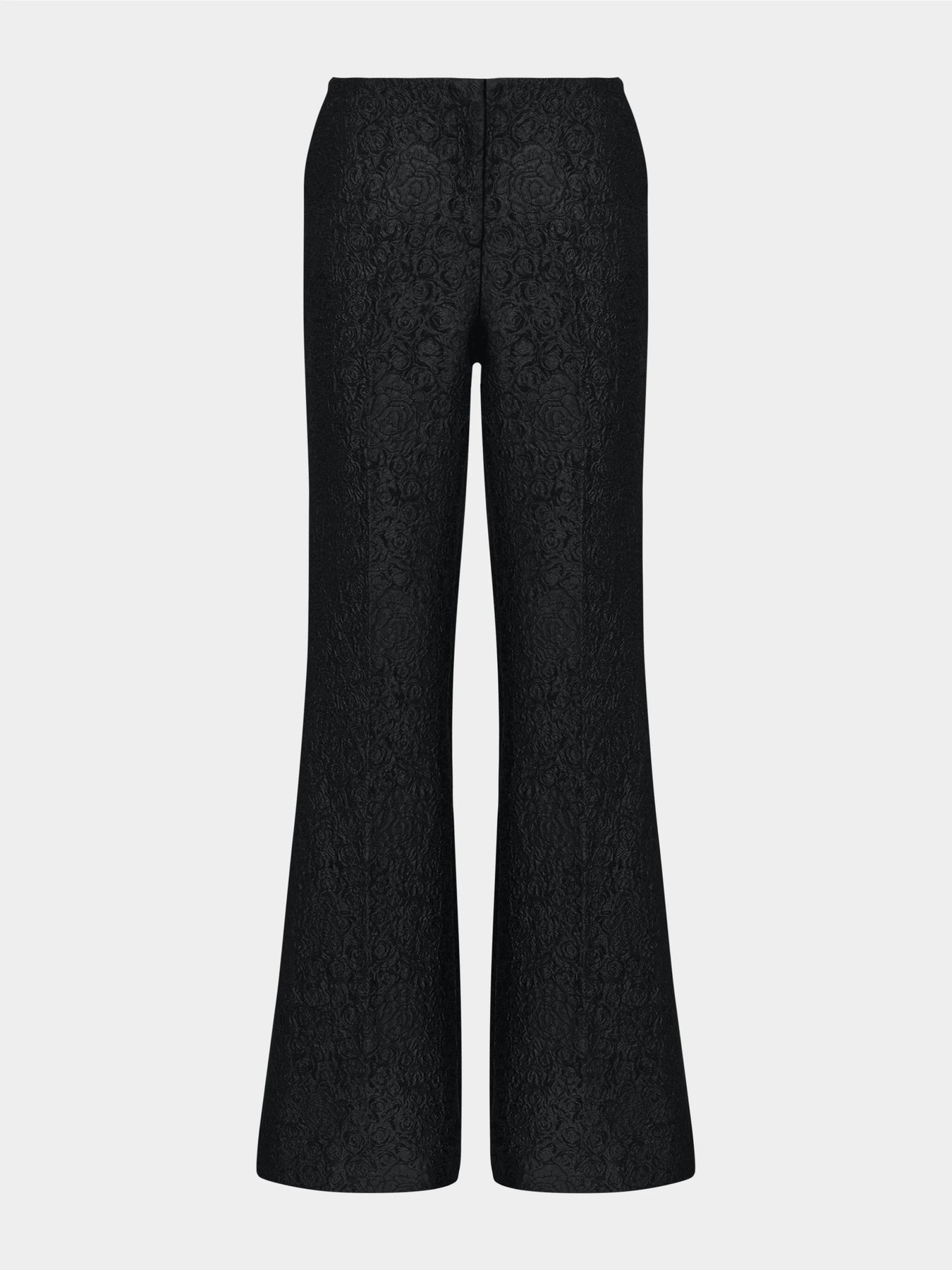 The Flute-B Trouser is a sleek, slim-fit design. These trousers feature a subtle fluted silhouette that adds elegance to the modern cut. The rose-patterned, rich brocade in black elevates the trousers into a signature wardrobe piece. Pair it with the matching Luma Jacket for a glamorous day-to-night look.