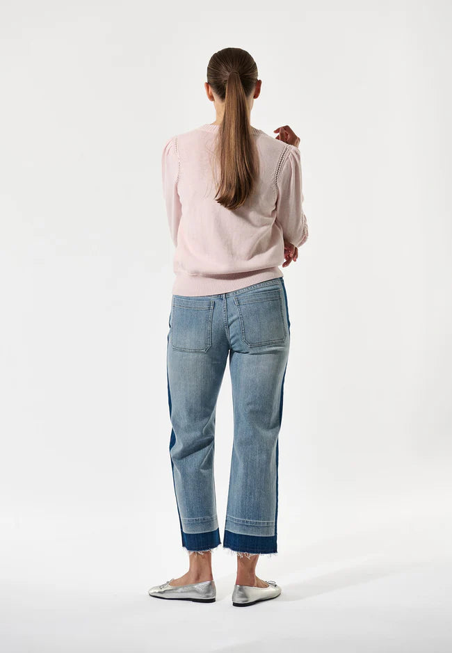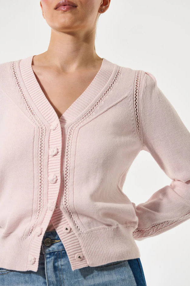 Delicate rows of lace stitch run down the front and around the shoulder seams of this cotton/wool blend cardigan in pale pink. Knit covered flower buttons are a delightful finishing touch. Wear with jeans during the day or over a silk dress in the evening.