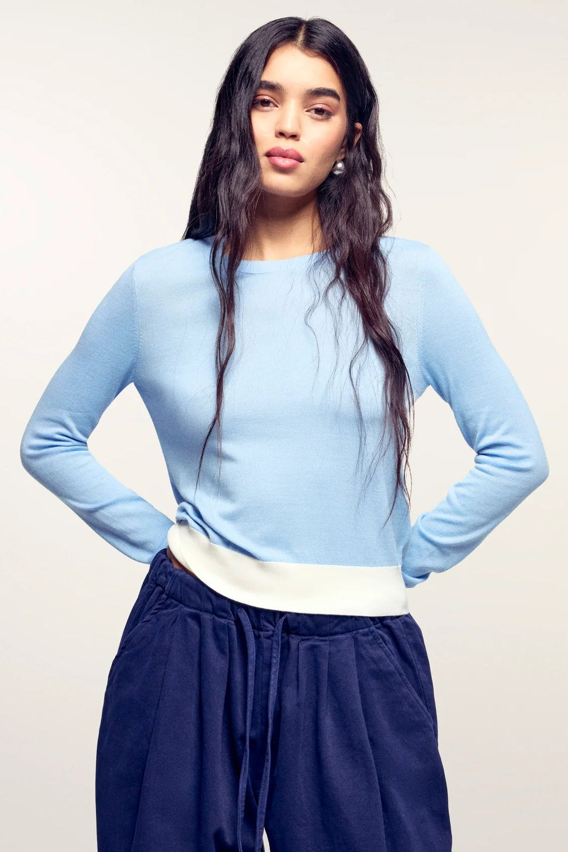 Made from 2-ply merino wool, this sweater features a cropped cut accentuated by a contrasting hem. With a round neck and long sleeves, it pairs effortlessly with casual jeans or a structured skirt.