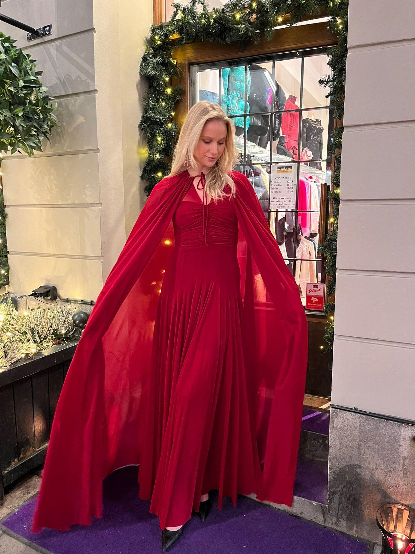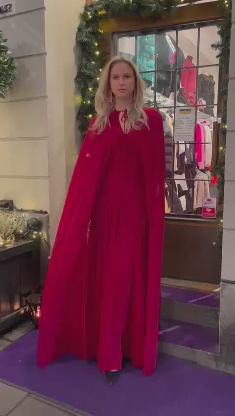 Long dress in stretch tulle with matching cape. The V-neckline is emphasized by flaps that play with crosses on the bodice and knot on the back. The silhouette is fitted at the waist, while it opens softly and with a flare on the skirt