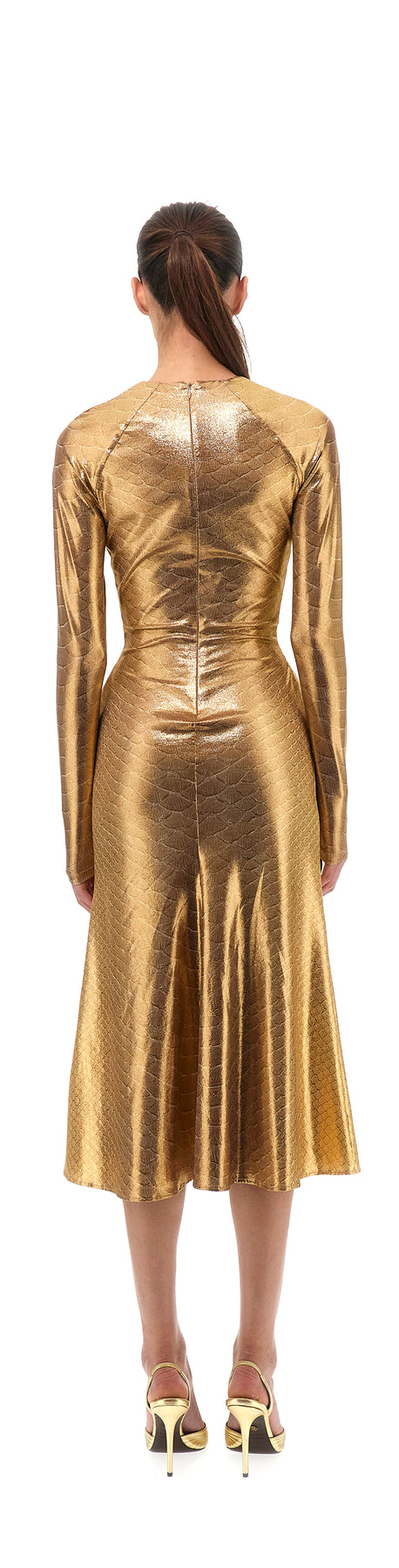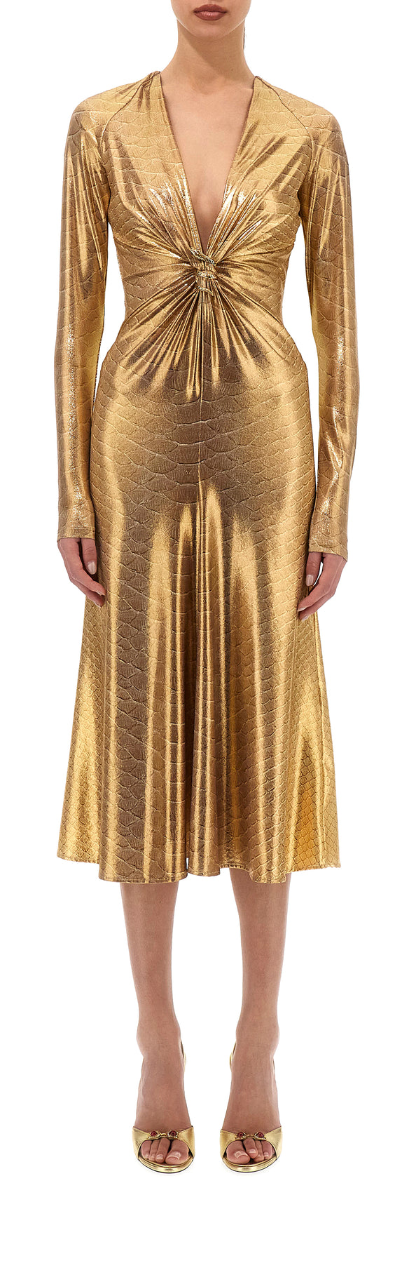 Refined yet versatile, this metallic-finish midi dress is defined by a Serpentine print that evokes the reptilian world, an enduring source of inspiration for the Roberto Cavalli Maison. The long-sleeved design features a deep V neckline that culminates in a twisted torchon detail with draping, embellished with a sinuous engraved metal serpent.