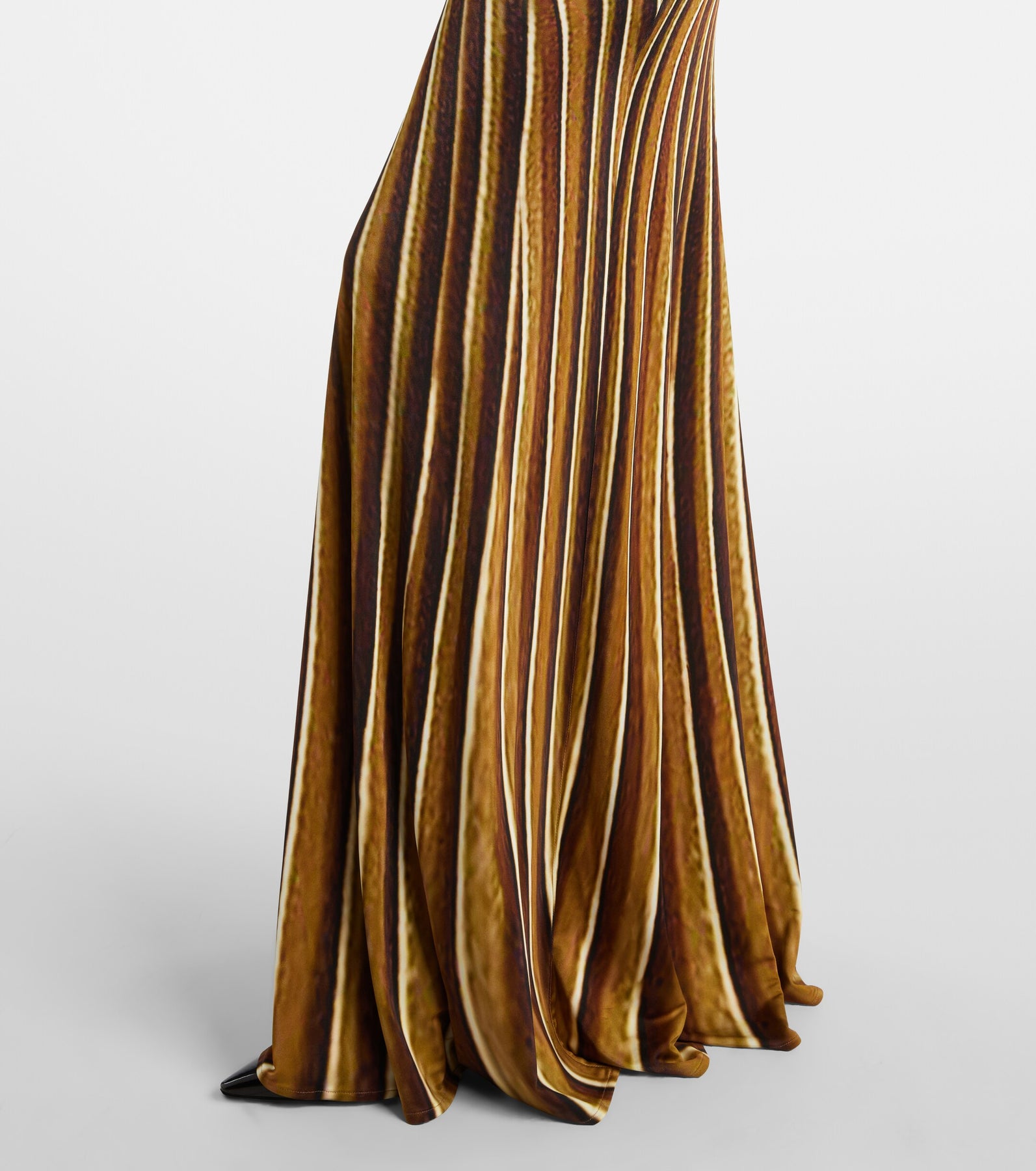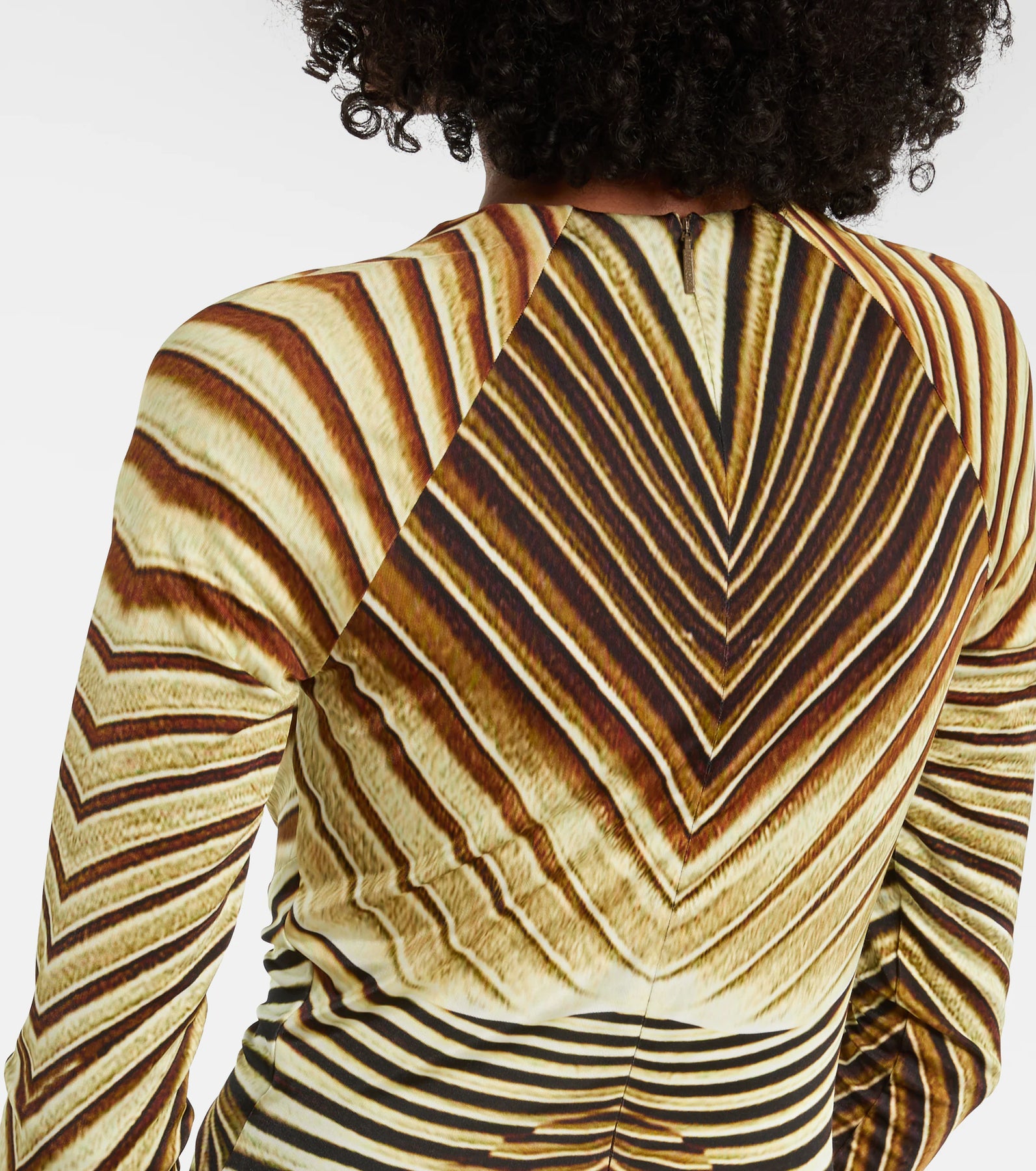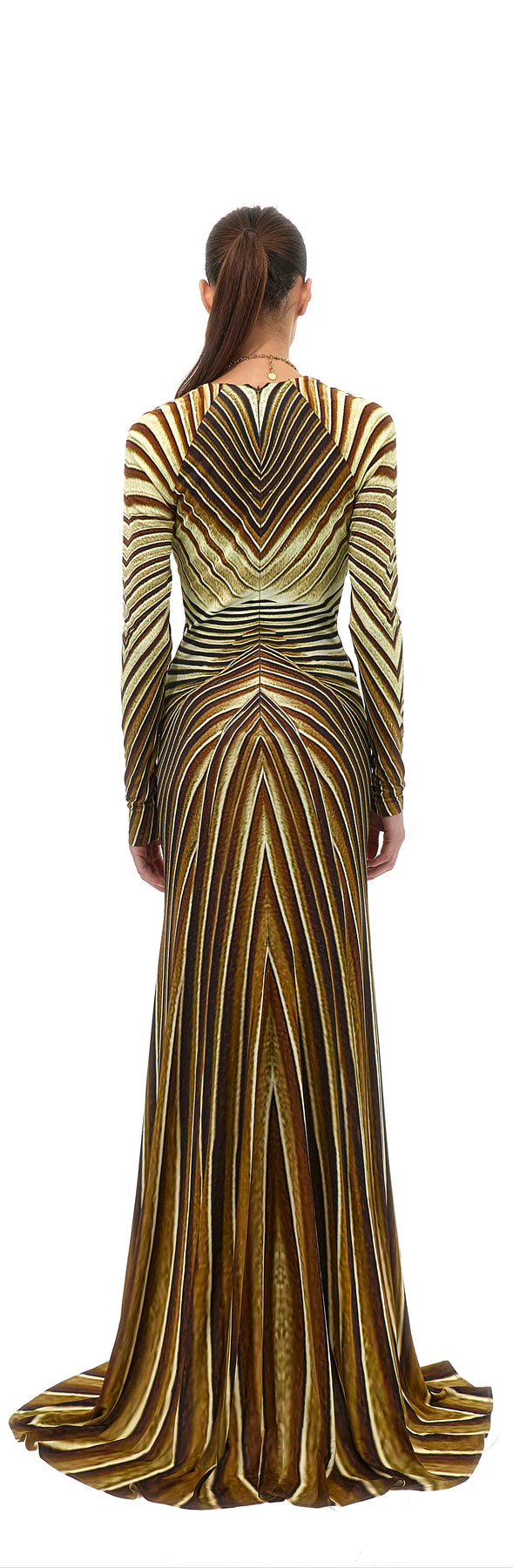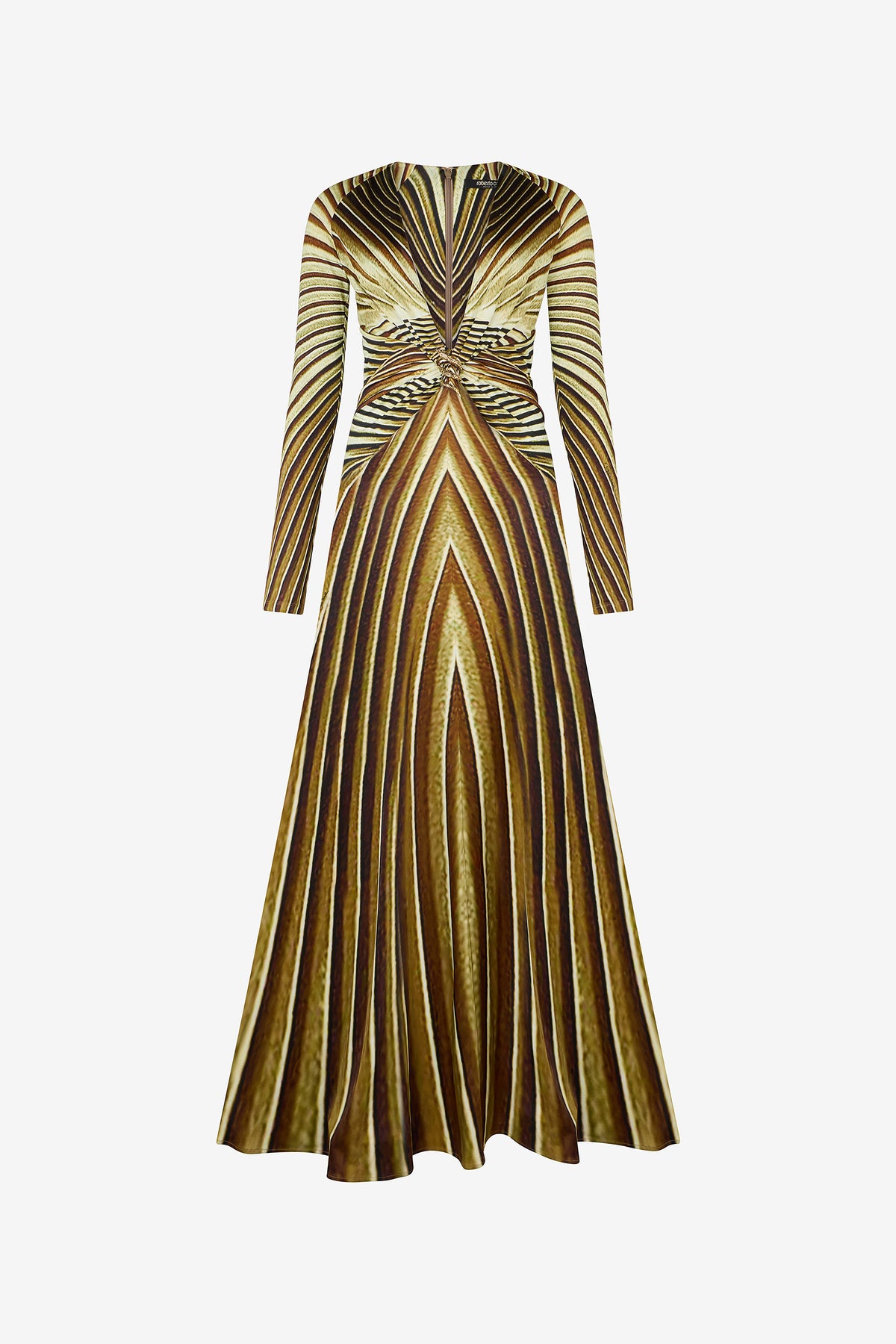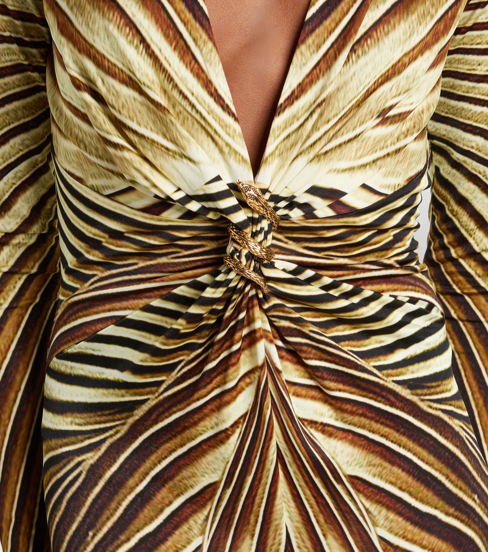 The Iside print, a tribute to the beauty and power of the sun, lends a distinctive style to this extra-long dress with a fluid silhouette. The long-sleeved design features a deep V-neckline that ends in a twisted torchon detail, wrapped by a sinuous metallic serpent with an engraved scale-effect finish.