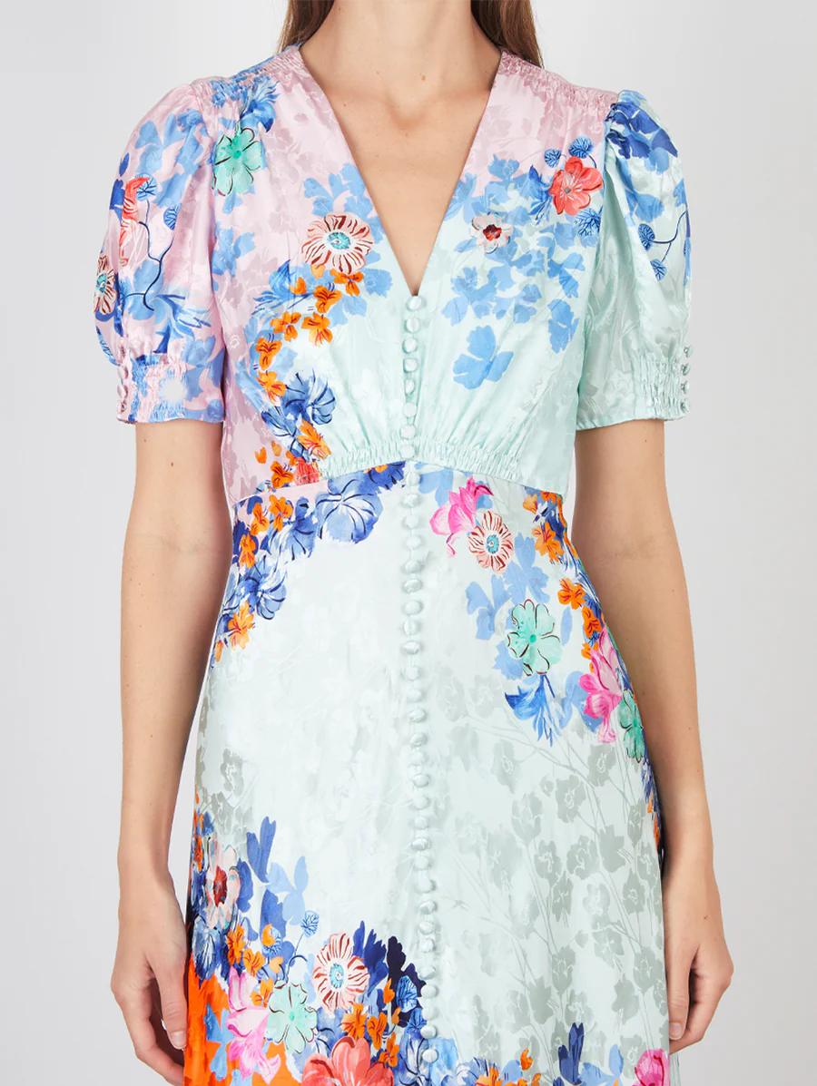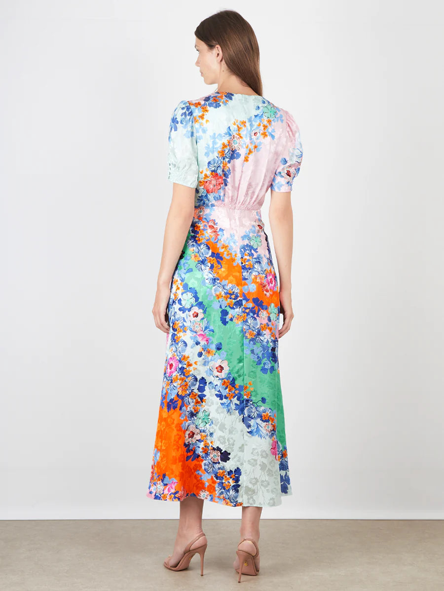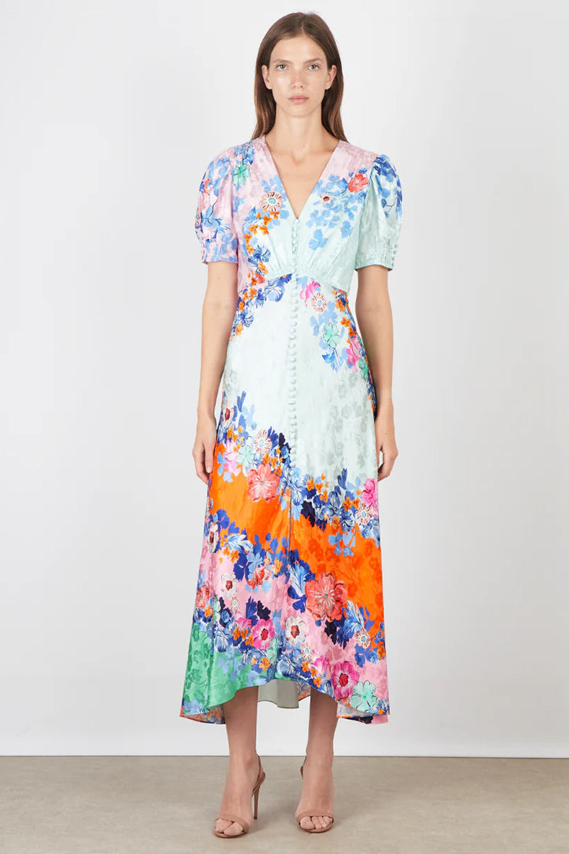 Amy Says... The Lea Long Dress is reimagined in a soft cascade of color-blocking, accented by sweeping placement of spring flowers, creating a dress with intense glamour yet romantic ease. The satin is realised in a masterly bias cut that flatters the figure. This fluid, graceful dress is a versatile option to style with heels or flats and accessories for day and special occasions.