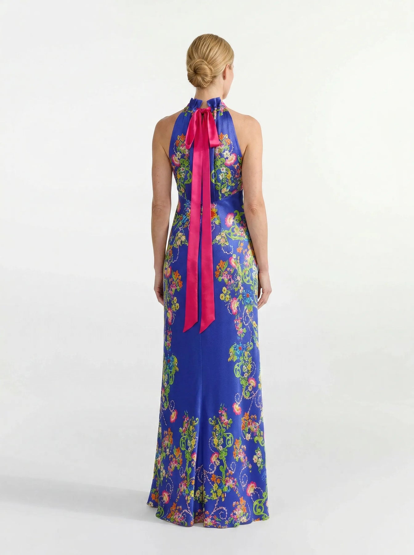 The Michelle Dress in Nerine Azure combines elegance with a bold, eye-catching design. Crafted from printed satin, this full-length silhouette features a dramatic gathered halterneck and a flattering empire waist to accentuate the figure. Inspired by Venetian art, a sophisticated engineered print placement accentuates the bold silhouette and showcases summery Nerine florals intertwined with ornate frames, on an azure base. Perfect for special occasions, this dress ensures magic with every step.