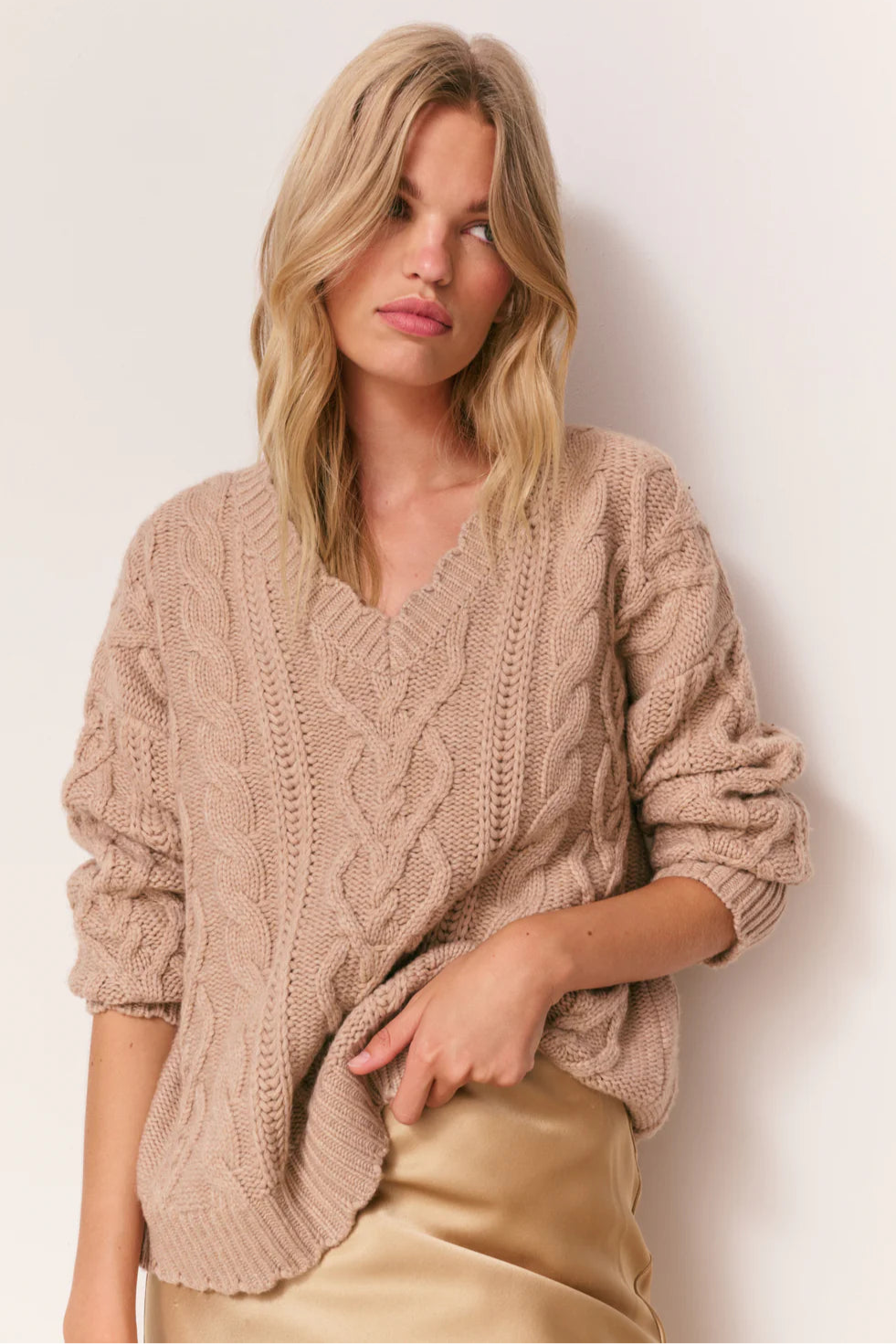 The Croisette Pullover is a cozy, romantic essential, crafted in a soft blend of wool and cashmere. This oversized slouchy V-neck sweater features thick heart-shaped cables down the front and along the princess seams, interspersed with smaller cables and delicate pointelle for texture and dimension. Scalloped edges and a wide V-neckline complete the feminine, effortless look, perfect for layering or wearing on its own for a soft, bohemian vibe.
