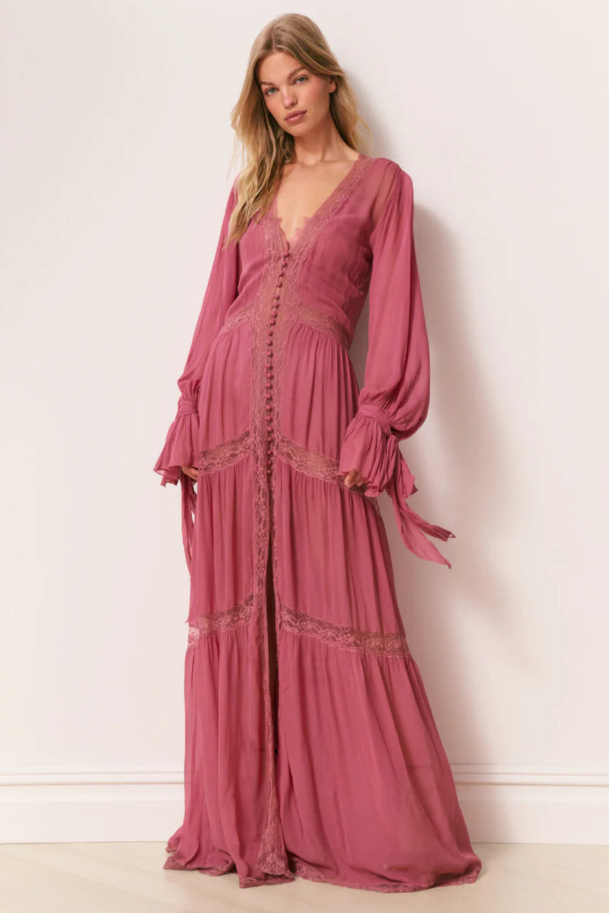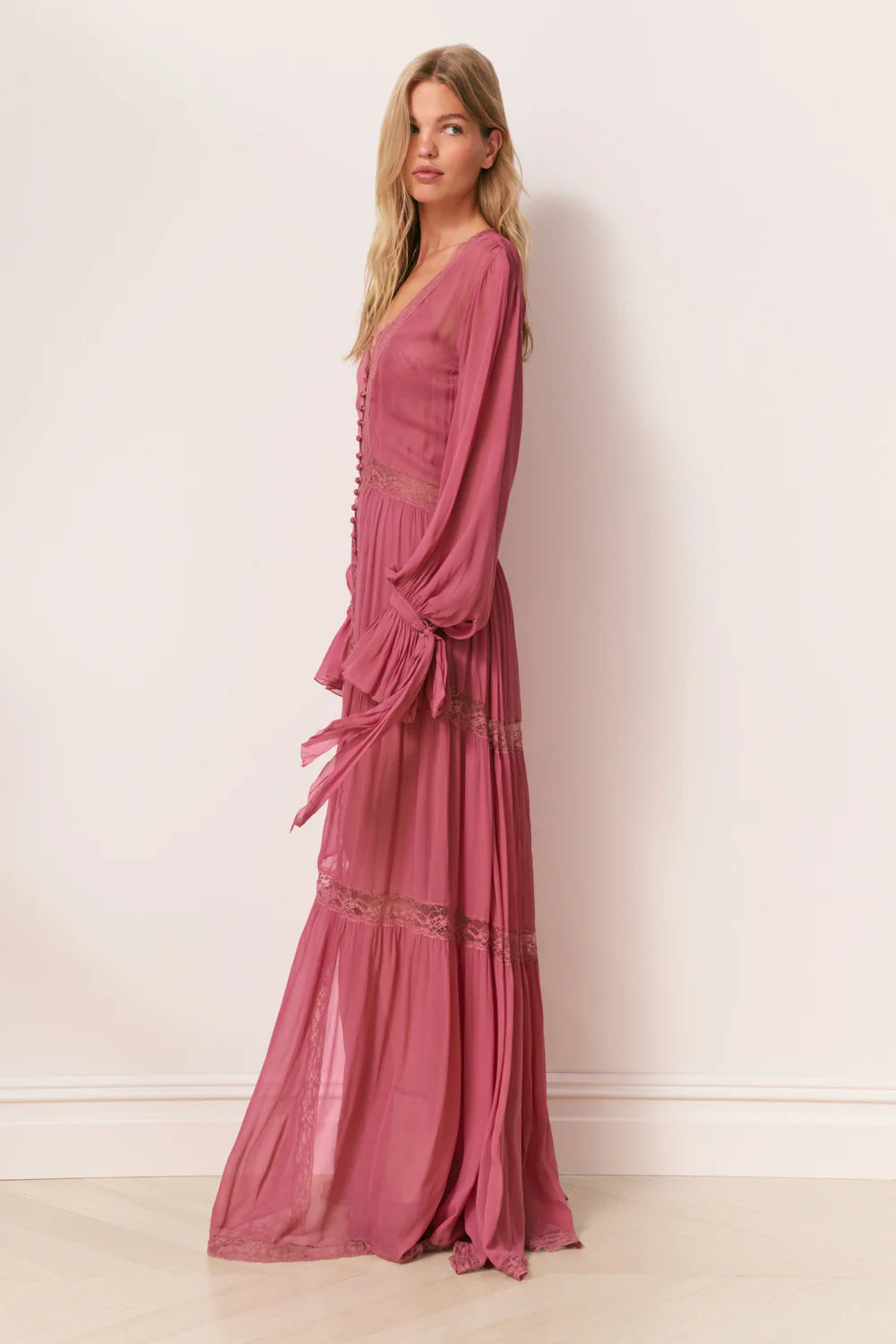 LOVESHACKFANCY LYVIENNE CHIFFON LACE MAXI DRESS - DEEP ROSE