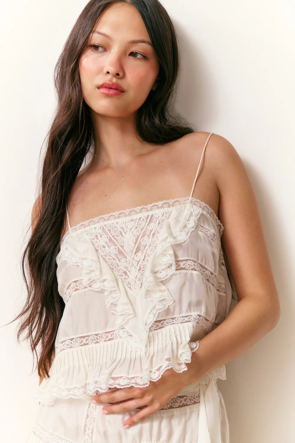 LOVESHACKFANCY ONDELINE SILK LACE RUFFLE CAMI - IVORY