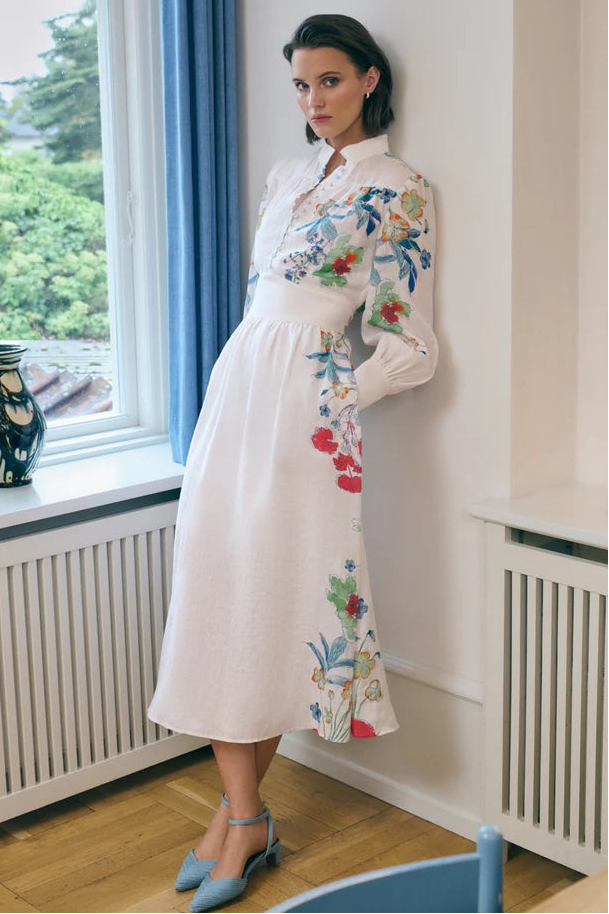 Painterly spring flowers create a burst of collar as they tumble down the skirt and sleeves of this elegant stand collared dress. Fitted at the bodice, the dress has a waist panel that can be pulled in by way of a self fabric belt. The skirt falls from the hips in a gentle flared shape that stops mid calf. Full sleeves and deep cuffs add to the silhouette and a row of small covered buttons down the front is a charming detail.