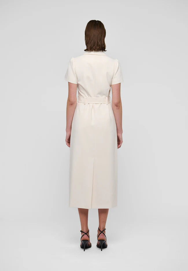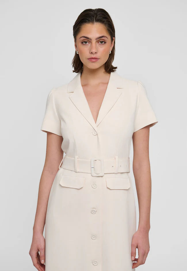 With its cool retro vibe, this short sleeved shirt dress in a cream viscose blend crepe fabric is chic and stylish. It has a regular revere collar, two flap pockets and buttons up the front. A wide belt with a fabric covered buckle defines the waist.