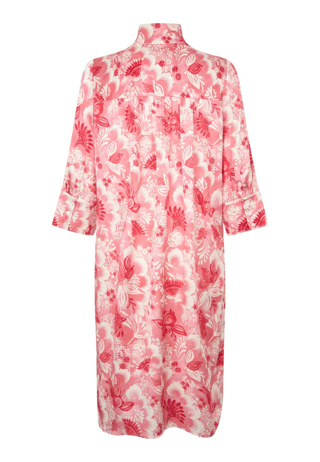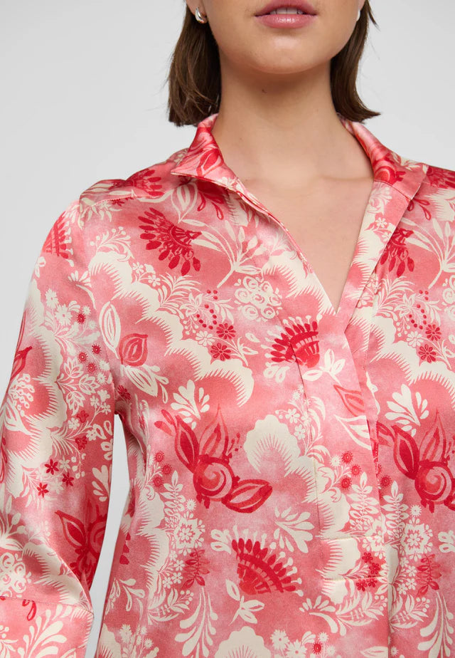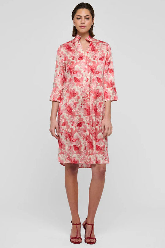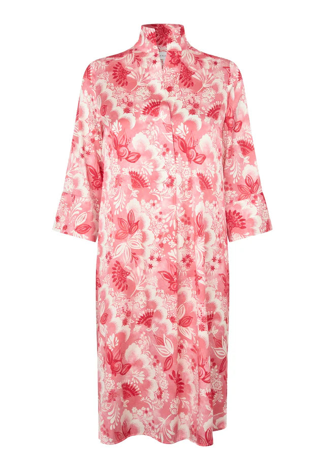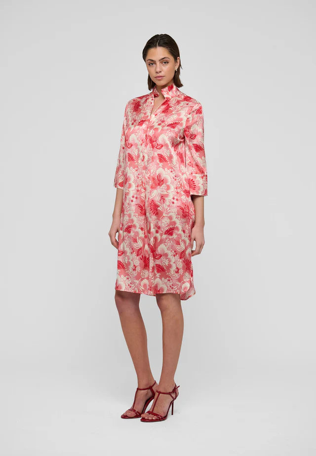 One of Dea Kudibal’s most popular and well known styles, this easy fit mid-calf length dress is perfect for all body shapes. The kimono neckline and collar give it an elegance whilst the deep sleeves with cover buttons have a laidback air. This chic version is in silk with bold red exotic flowers printed onto a pale background.