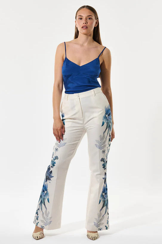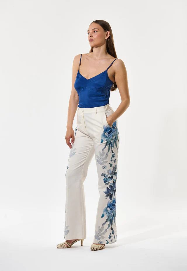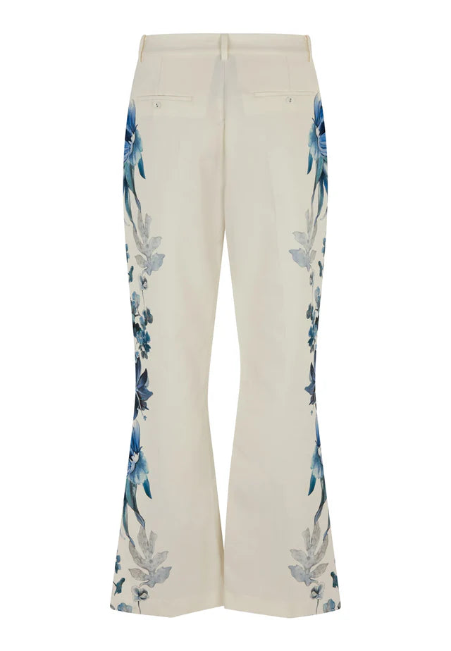 Bright blue flowers tumble down the legs of these flared cotton/silk blend trousers making them a bold and chic statement. In a regular fit falling to a slight flare, the pants have a pressed front crease and two buttoned welt pockets at the back. Wear with a simple top or match with the Zinsa blazer to make a dramatic suit.