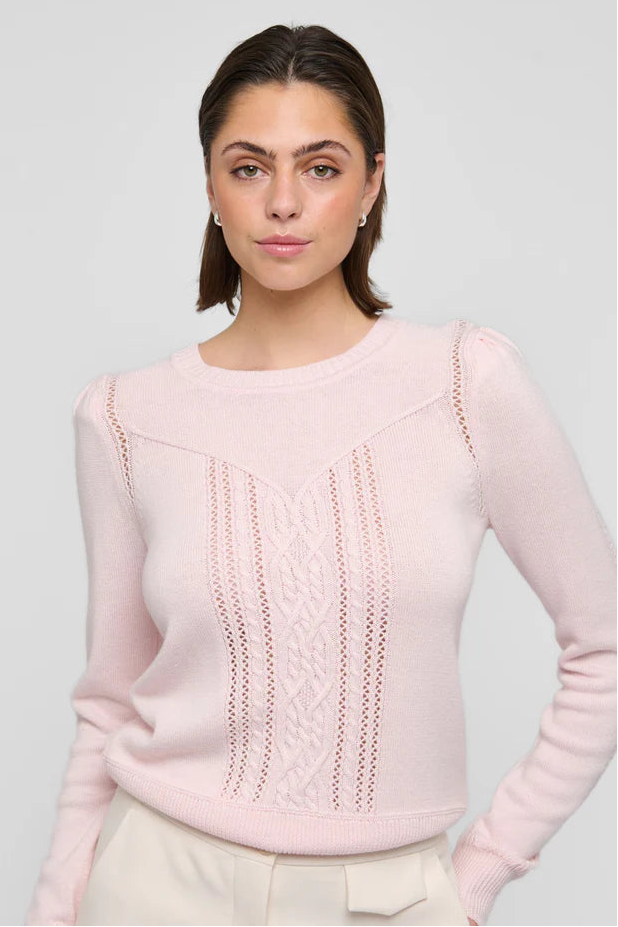 Dainty cabling and lace stitching run down the centre body and sleeves of this round neck sweater whilst a seam accentuates the bust line. Knitted in a cotton/wool blend in pale pink, the sweater has more lace knit and gathers around the shoulders.