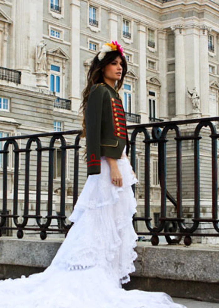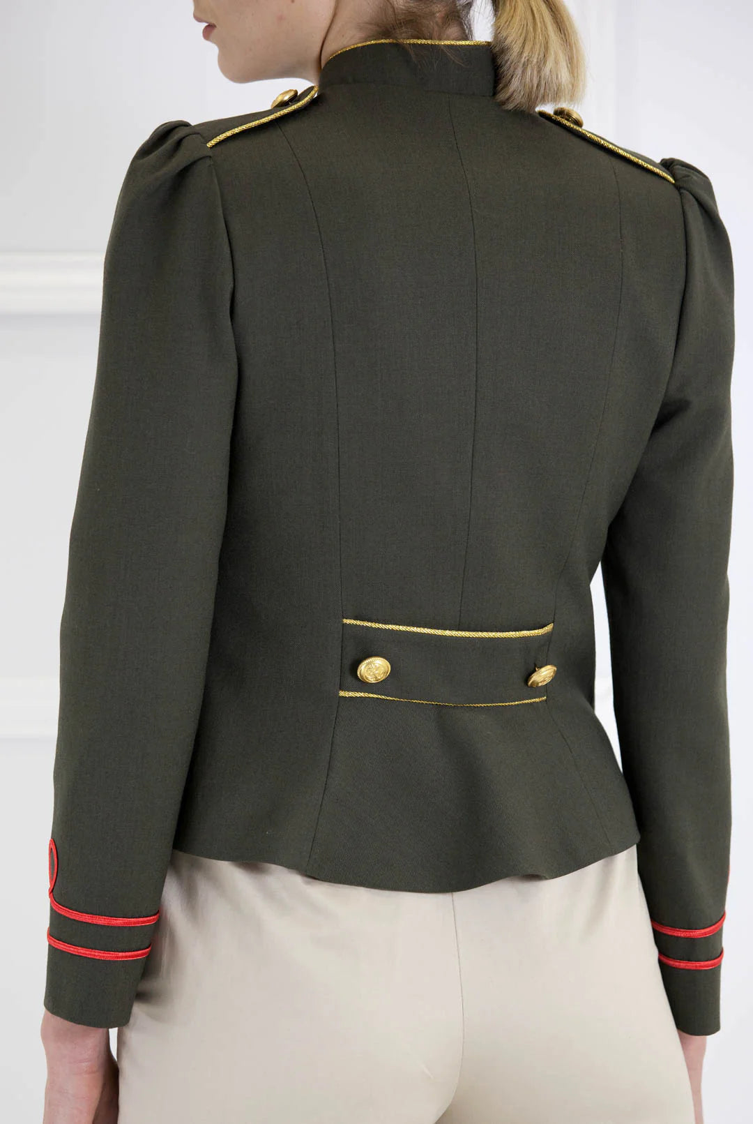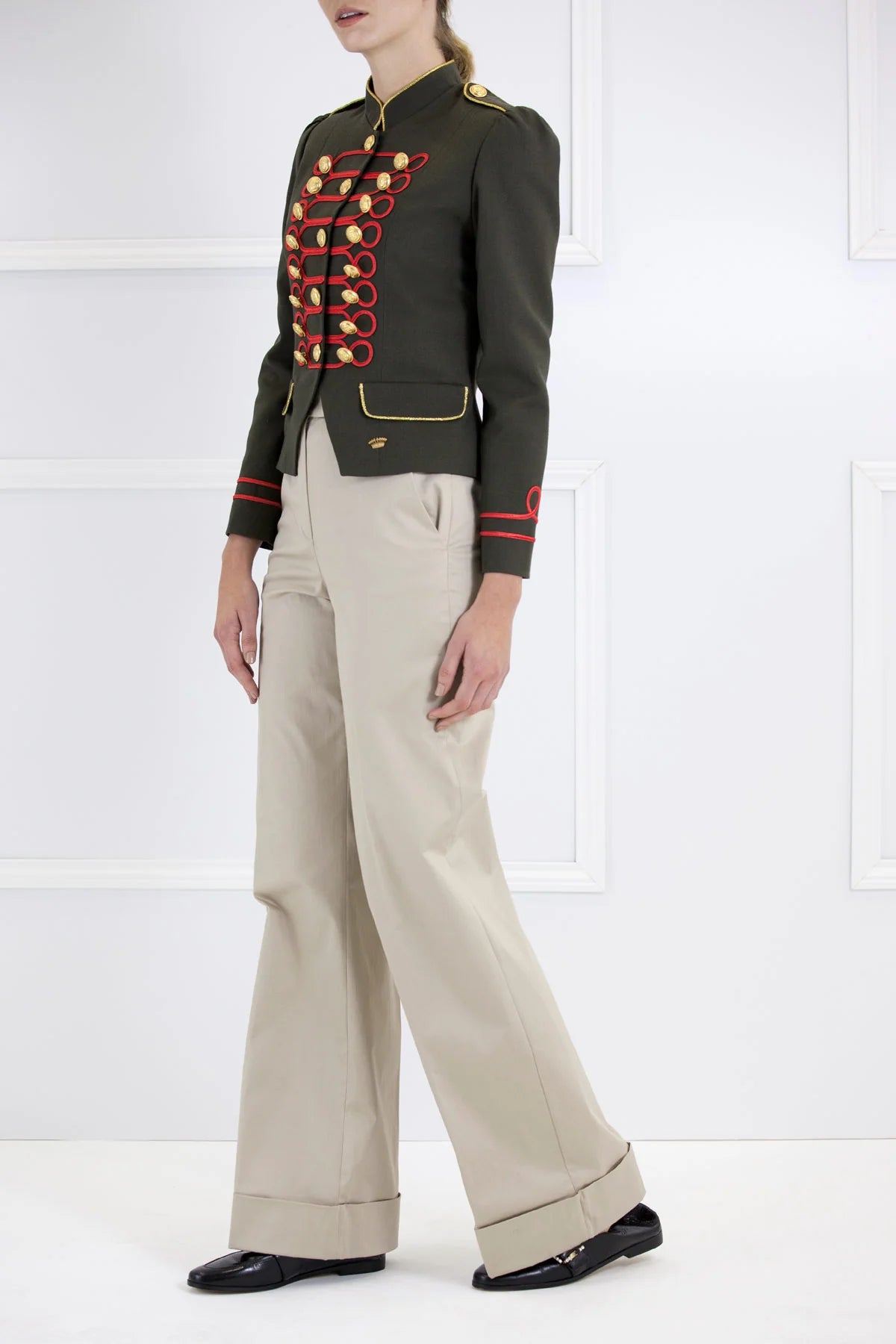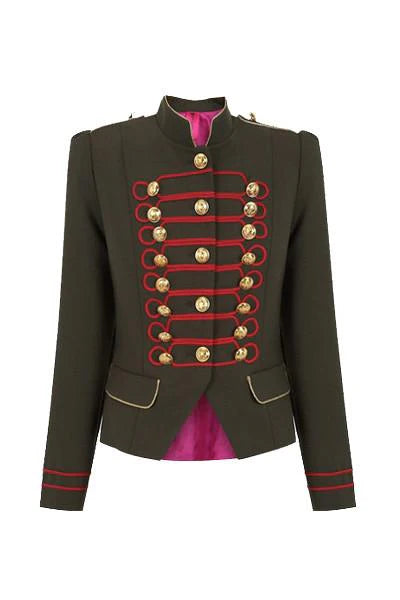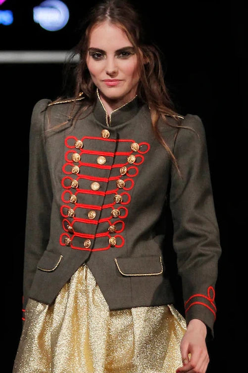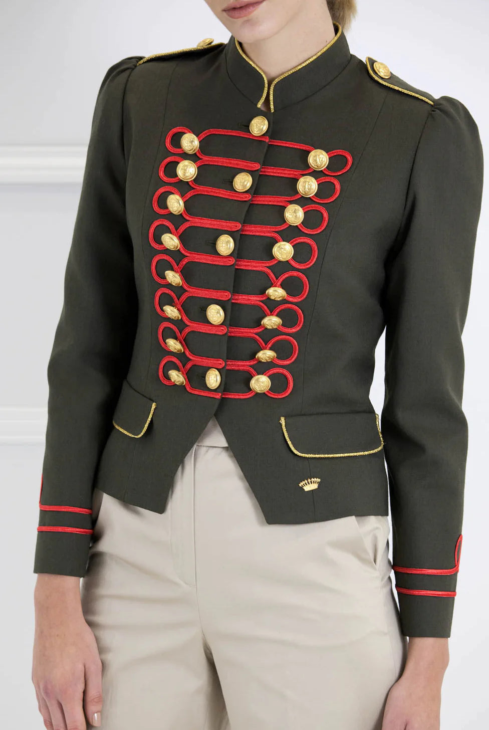 The Condesa Beatle jacket in green with a red cord is one of La Condesa's great classics. It's a military-inspired jacket made of green twill, fitted at the waist to flatter the figure.