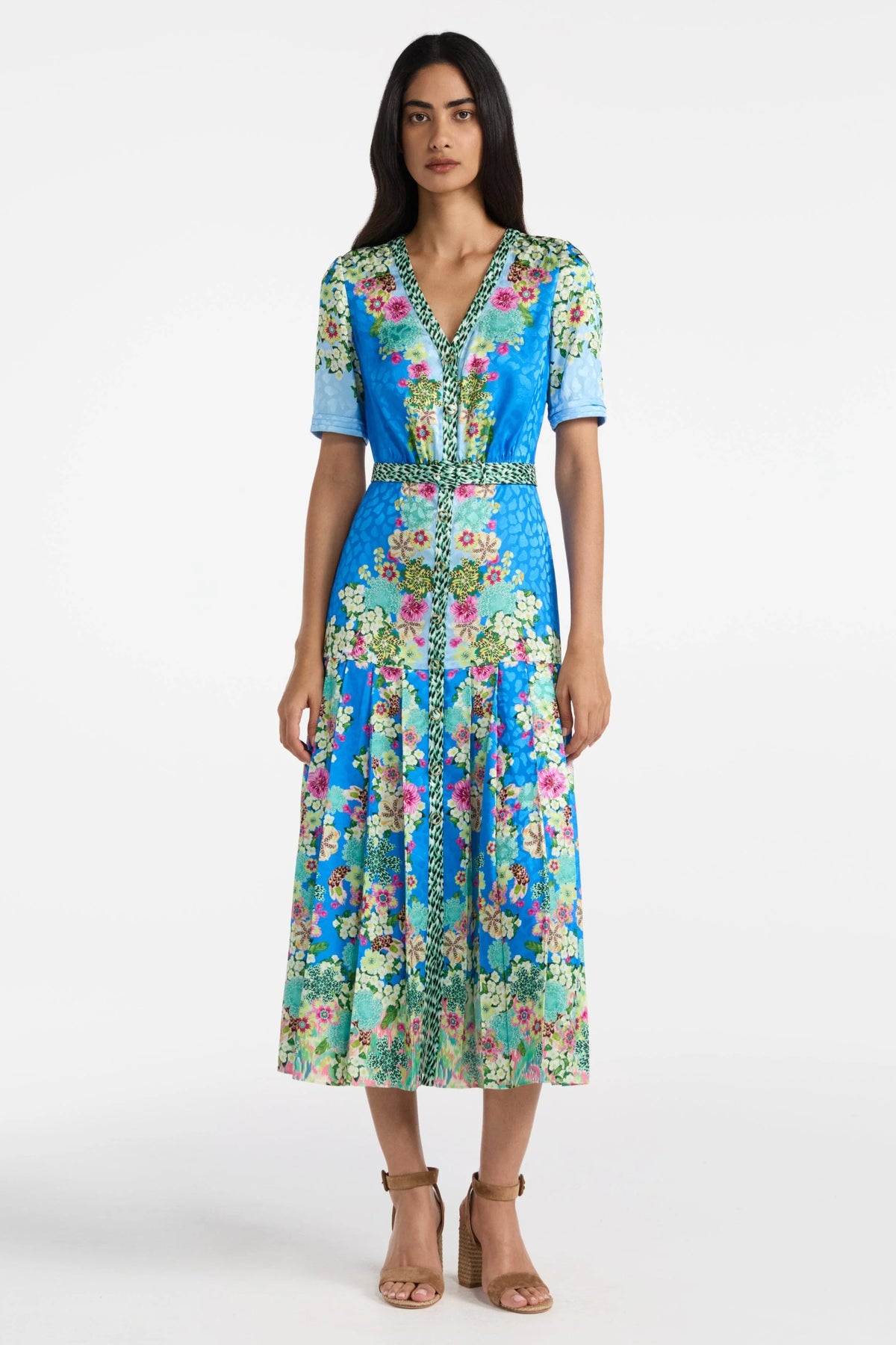 The Lea Shirt-C Dress combines relaxed structure with playful detailing. Crafted from stamped satin, it features a roomy and comfortable fit, balanced by a pleated skirt that moves gracefully with every step. A contrasting placket and belt add modern, graphic accents. Striking tonal borders run sinuously over a light blue background, complemented by exquisite florals and graphic feather accents. A unique statement piece for day and evening events.