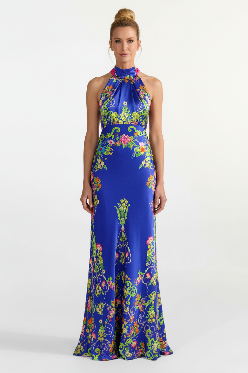The Michelle Dress in Nerine Azure combines elegance with a bold, eye-catching design. Crafted from printed satin, this full-length silhouette features a dramatic gathered halterneck and a flattering empire waist to accentuate the figure. Inspired by Venetian art, a sophisticated engineered print placement accentuates the bold silhouette and showcases summery Nerine florals intertwined with ornate frames, on an azure base. Perfect for special occasions, this dress ensures magic with every step.