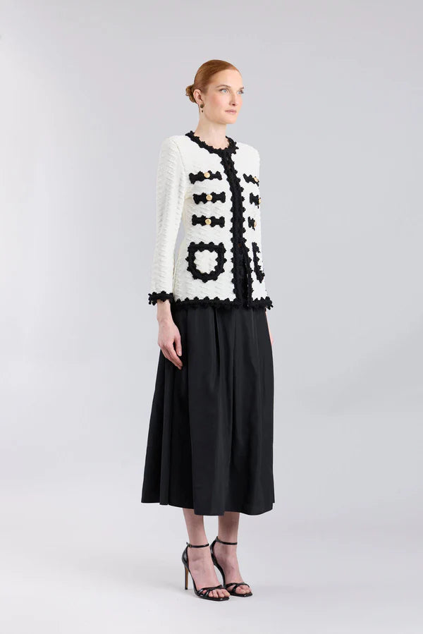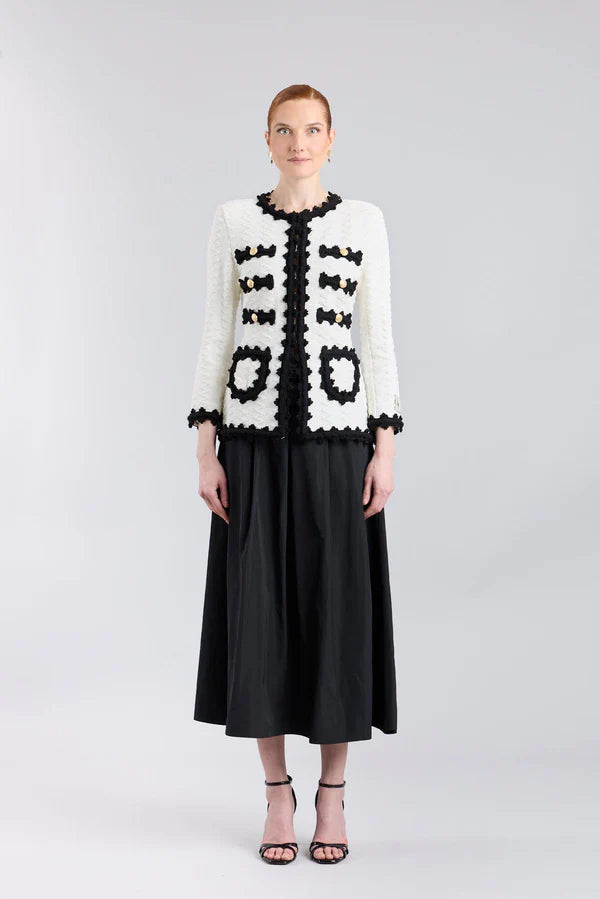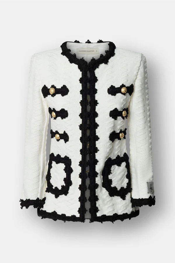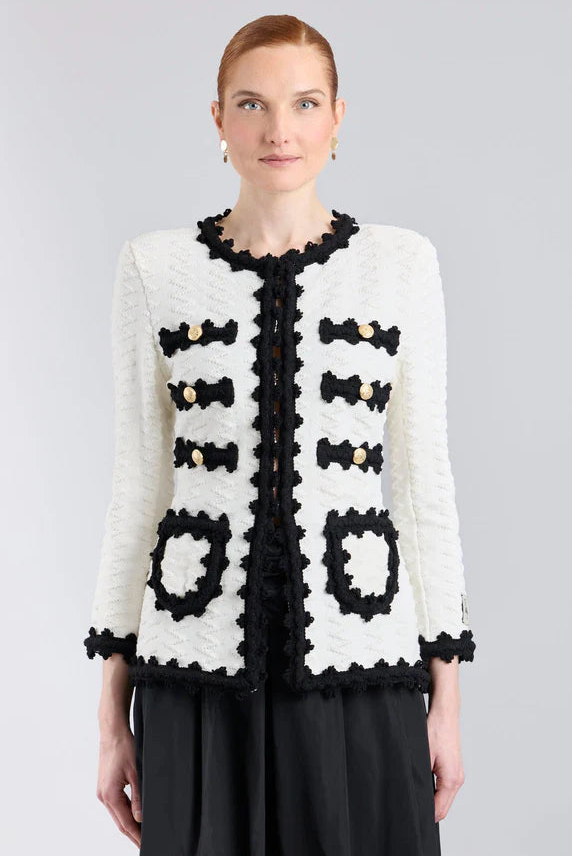 The Oliver black and white knit jacket is an ode to understated sophistication and impeccable contrast. Its design features a complex, pristine white knit pattern with a subtle relief, lending a refined texture that elevates the traditional knitwear to the status of a jewel. The black piping that outlines the six front pockets and the closure acts as a frame of striking elegance, making this piece the perfect balance between lightness and the character that defines our brand .