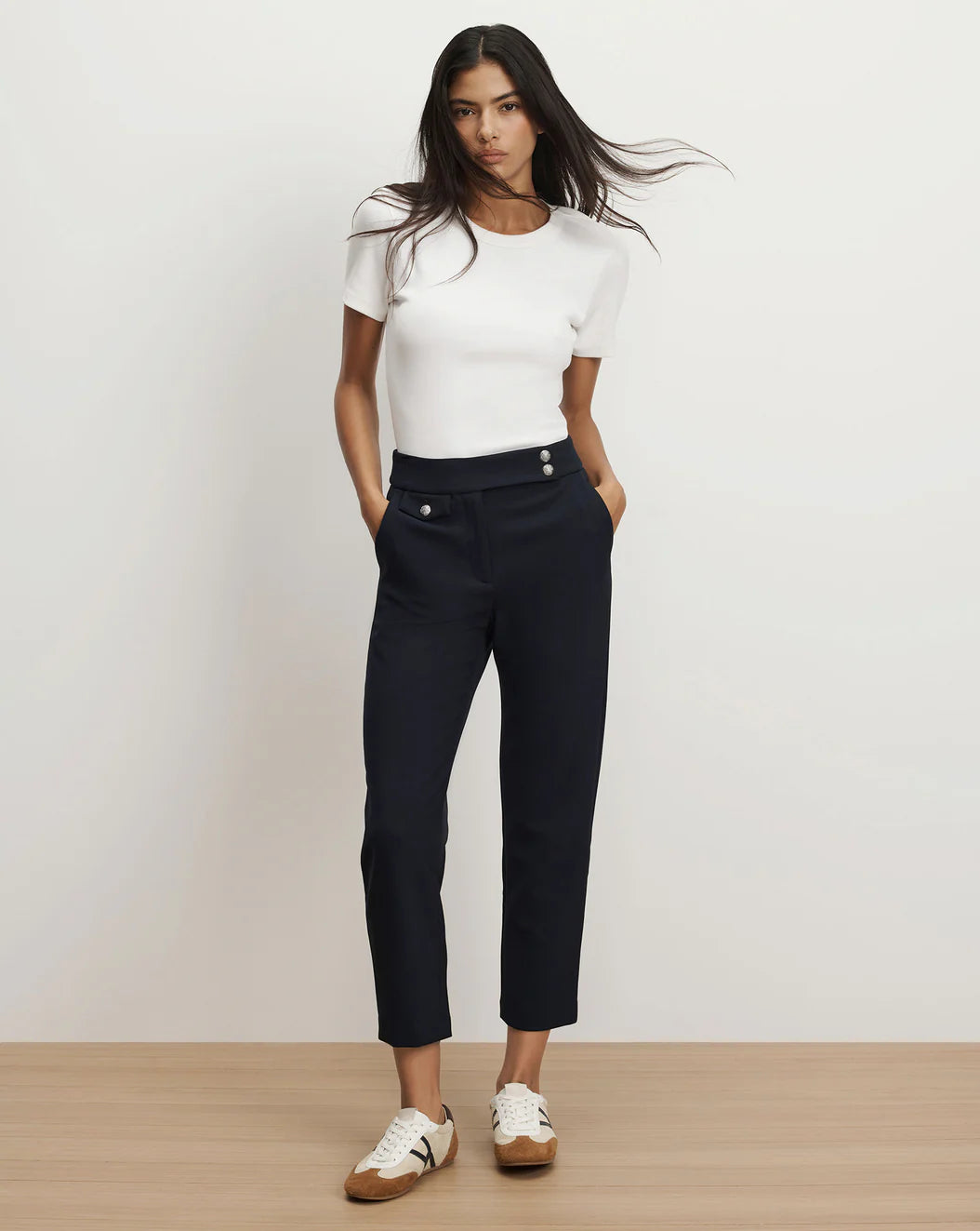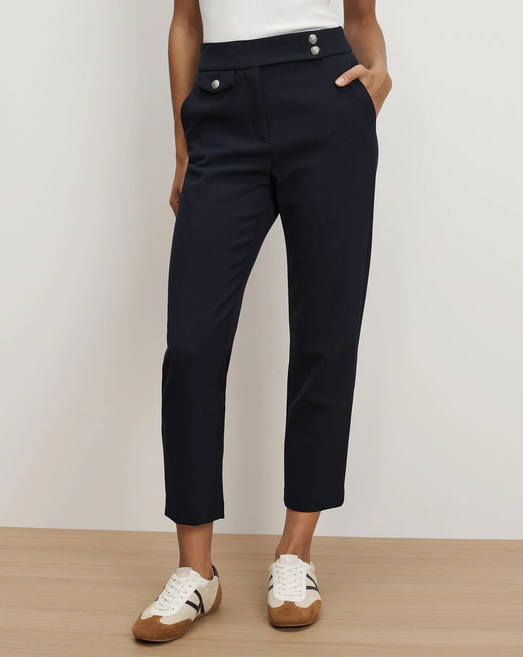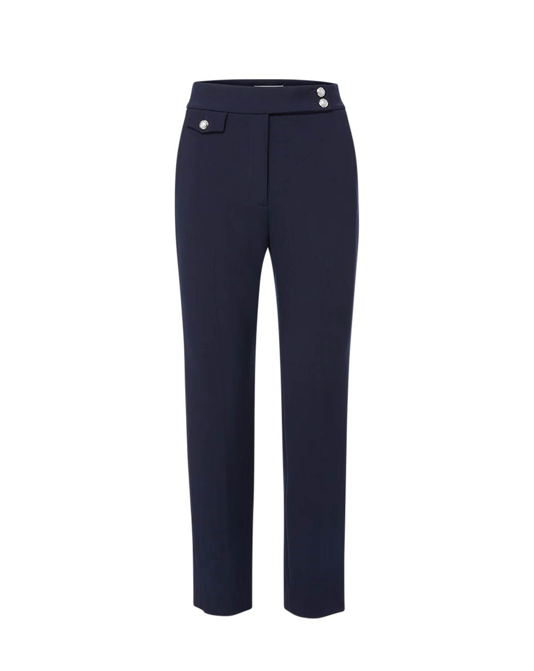 A slim leg and streamlined silhouette make our Renzo pants a go-to pair for the office. Finished with a cropped ankle and our signature crest buttons, it delivers a polished, tailored look. Wear with a feminine blouse and statement heels—or pair with the Miller Dickey Jacket for a matching set.
