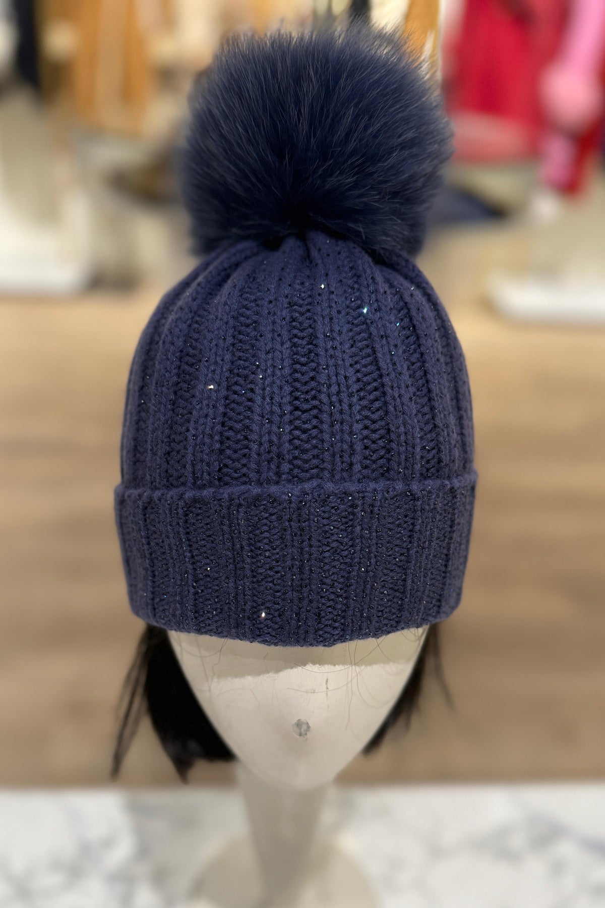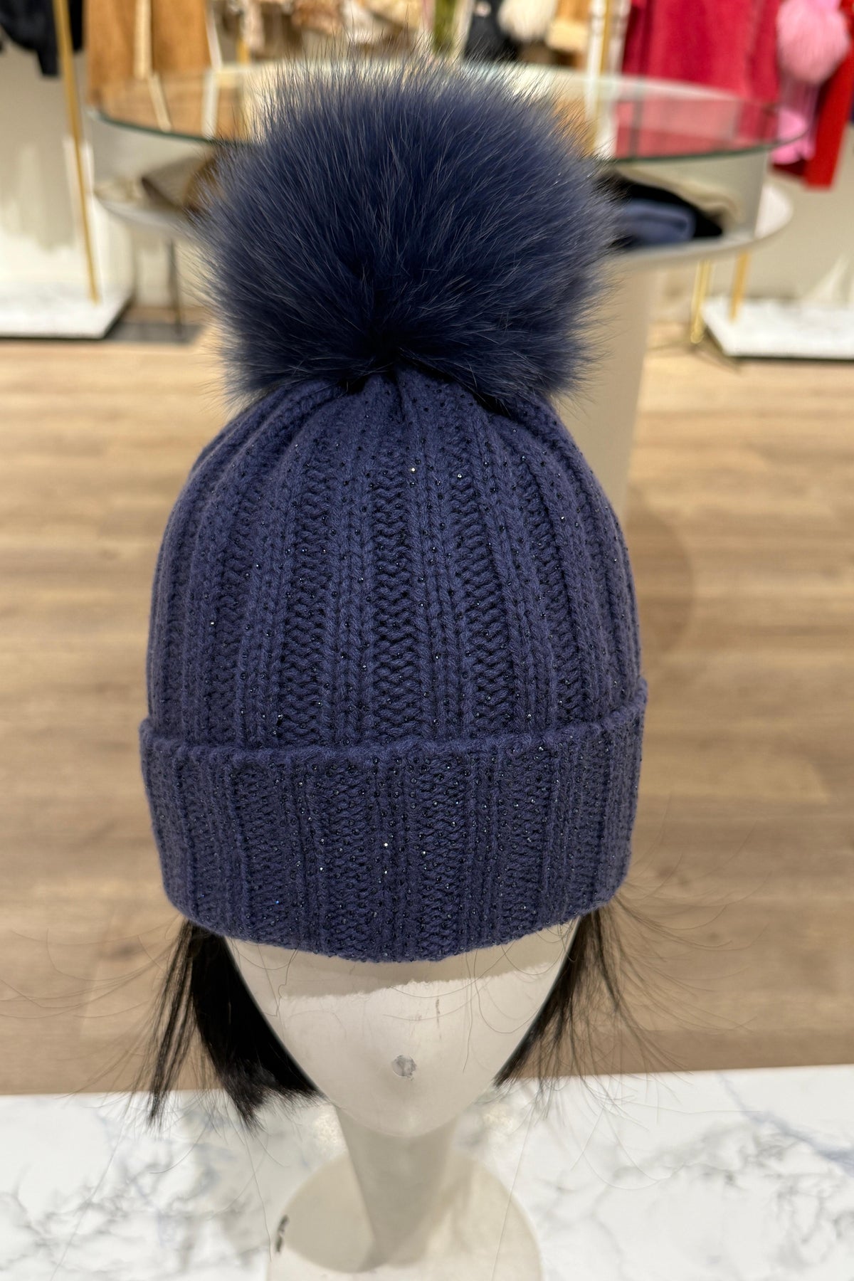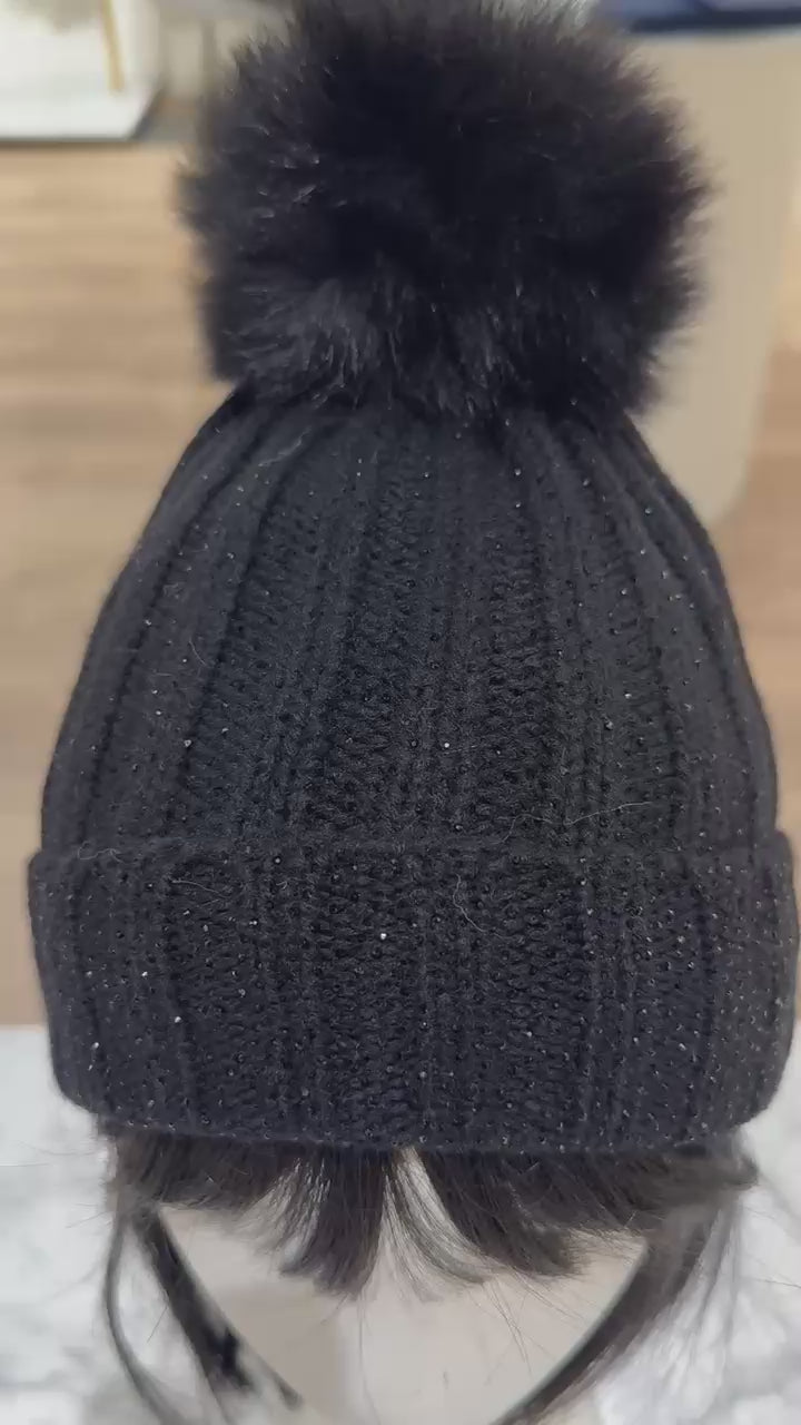 Ribbed wool hat with dense tone-on-tone rhinestones and a Murmasky pom pom. Stretchy, soft-touch ribbed knit. Comfortable, snug, and snug fit. Fox fur pompom.