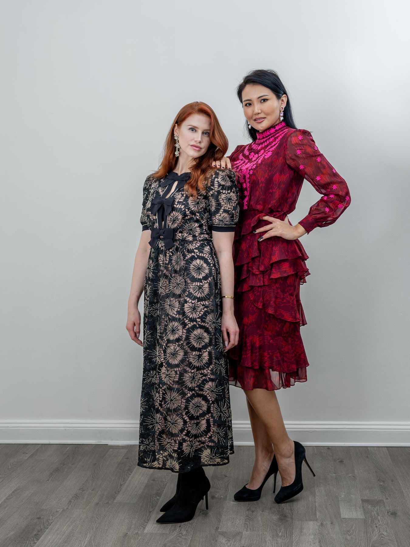 The Isa Ruffle Dress is reimagined this season in a rich-hued Astible Burgundy print, blending timeless charm with modern elegance. Made from lustrous silk, this midi-length dress features a stylish neckband, gently puffed long sleeves, and a soft blouson bodice that highlights the waist. An asymmetrical frill at the hem adds playful movement, accentuating this captivating statement piece.