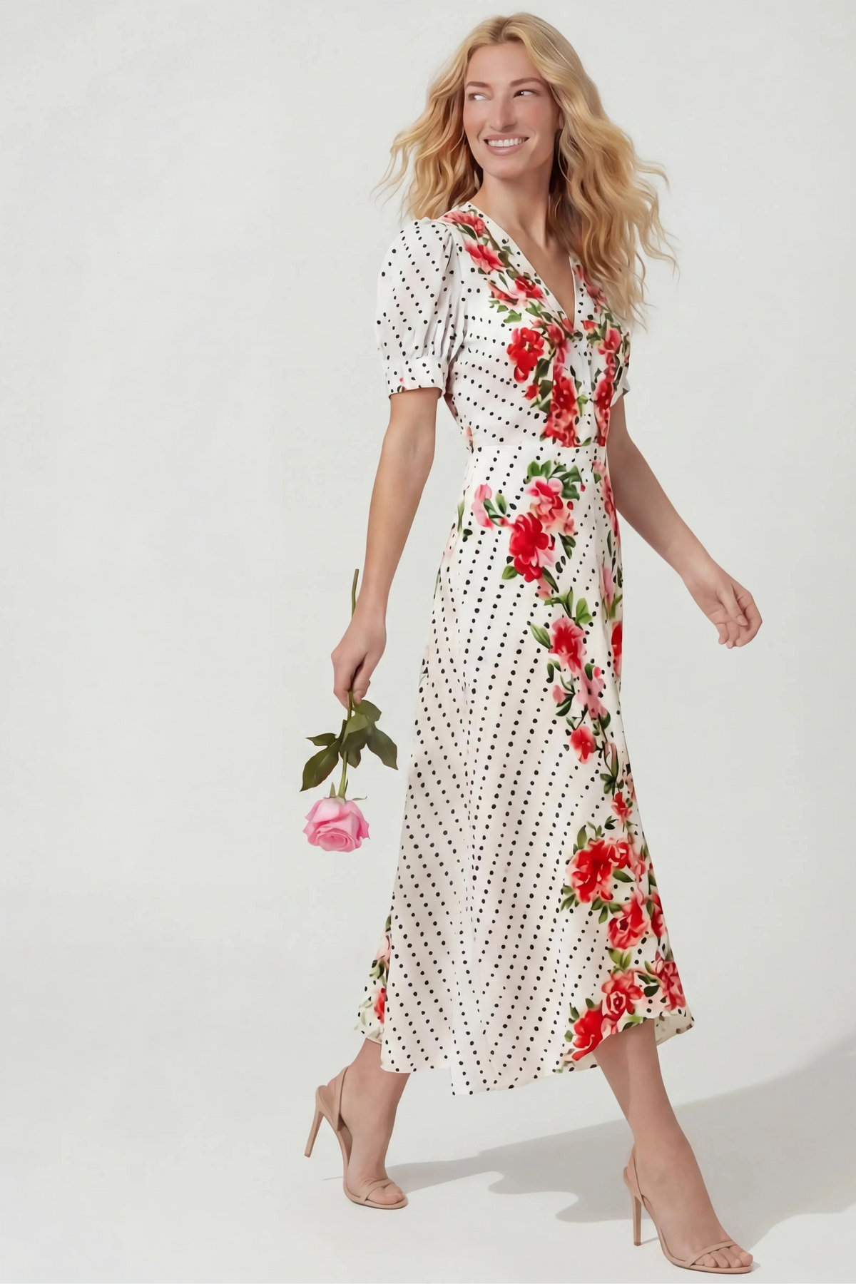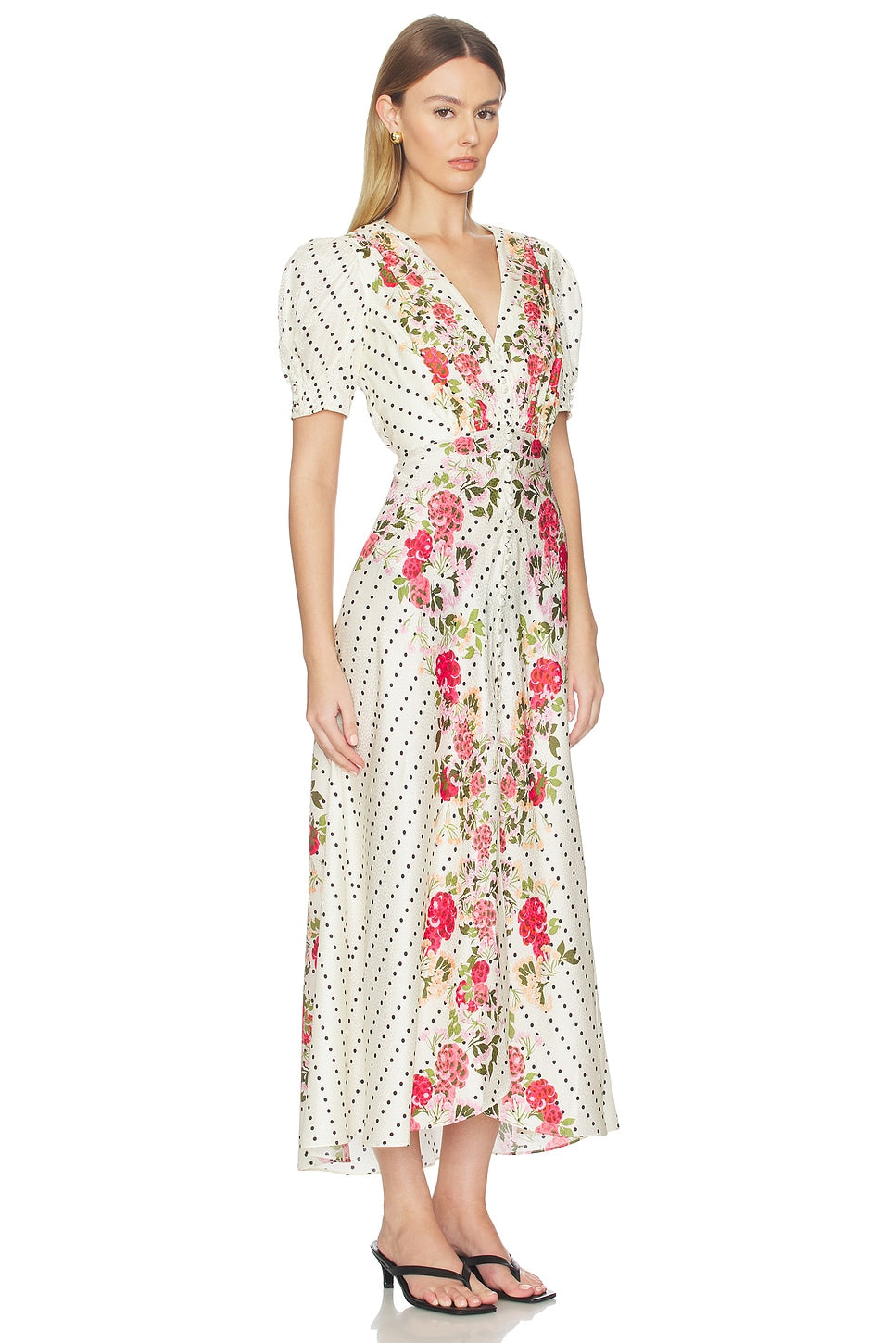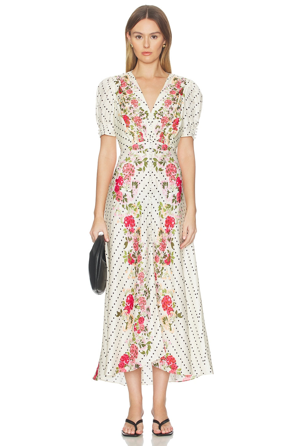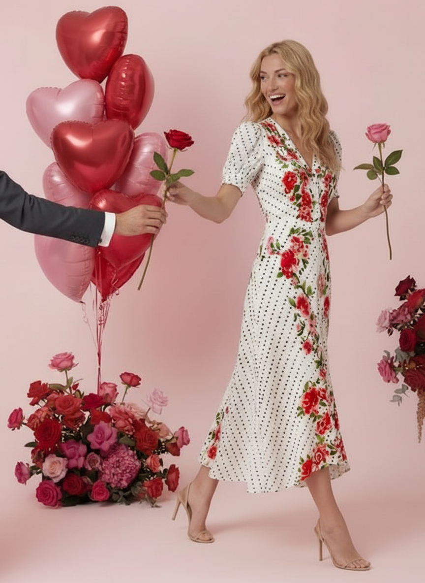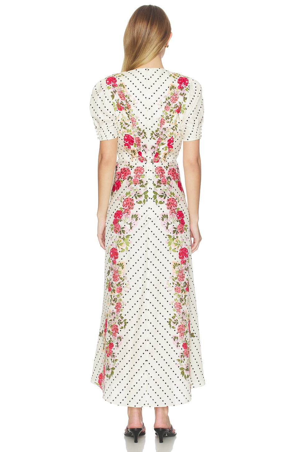 The Lea Long Dress is a signature SALONI SHAPE beloved by customers across continents and generations. Crafted from stamped satin in a meticulously executed bias cut, it drapes beautifully and flatters the figure. The graceful silhouette is accented by a sophisticated print placement featuring classic polka dots framed by a soft rose-toned floral border. It can be effortlessly styled with heels or flats, the perfect go-to dress for any occasion.