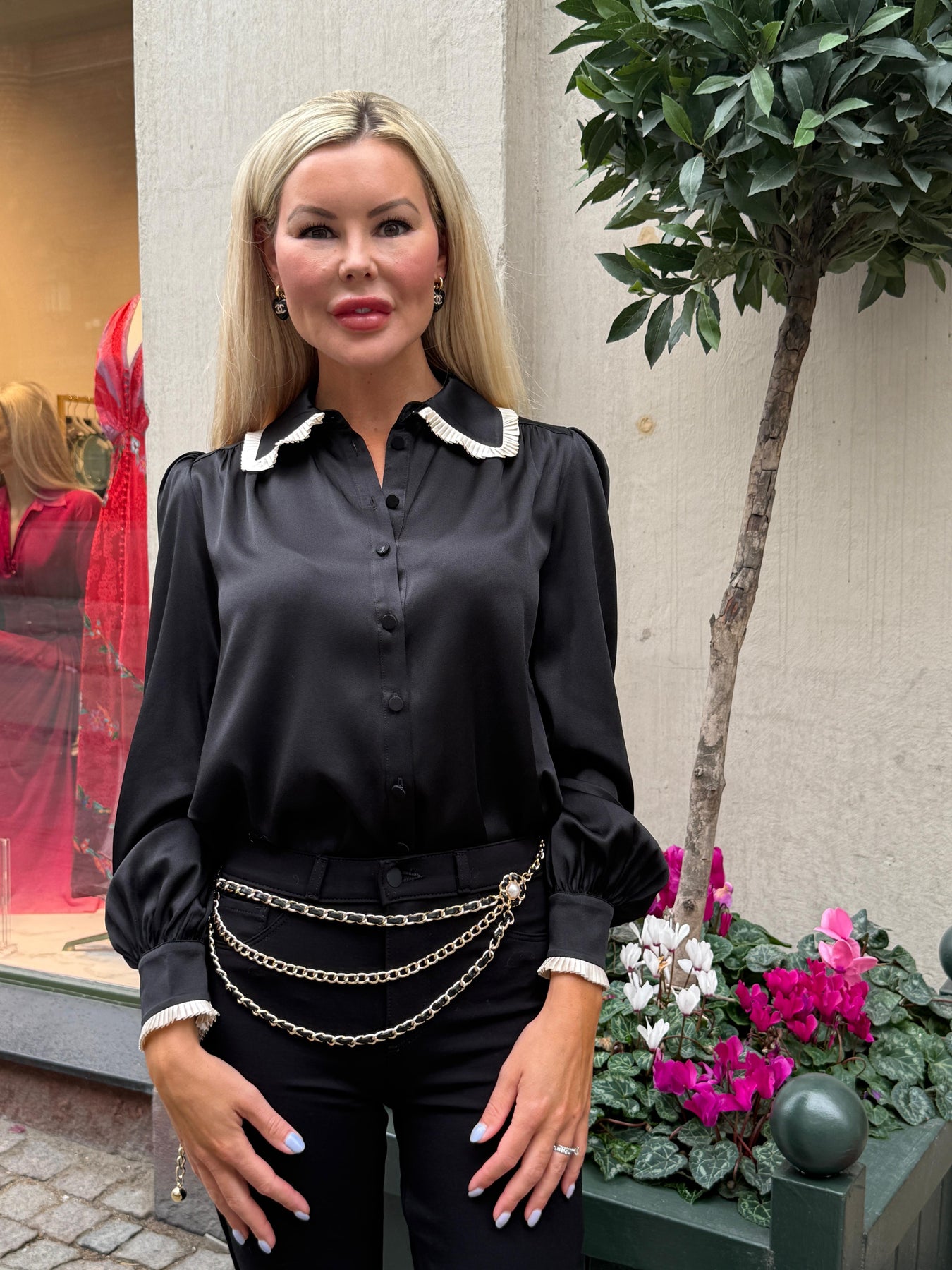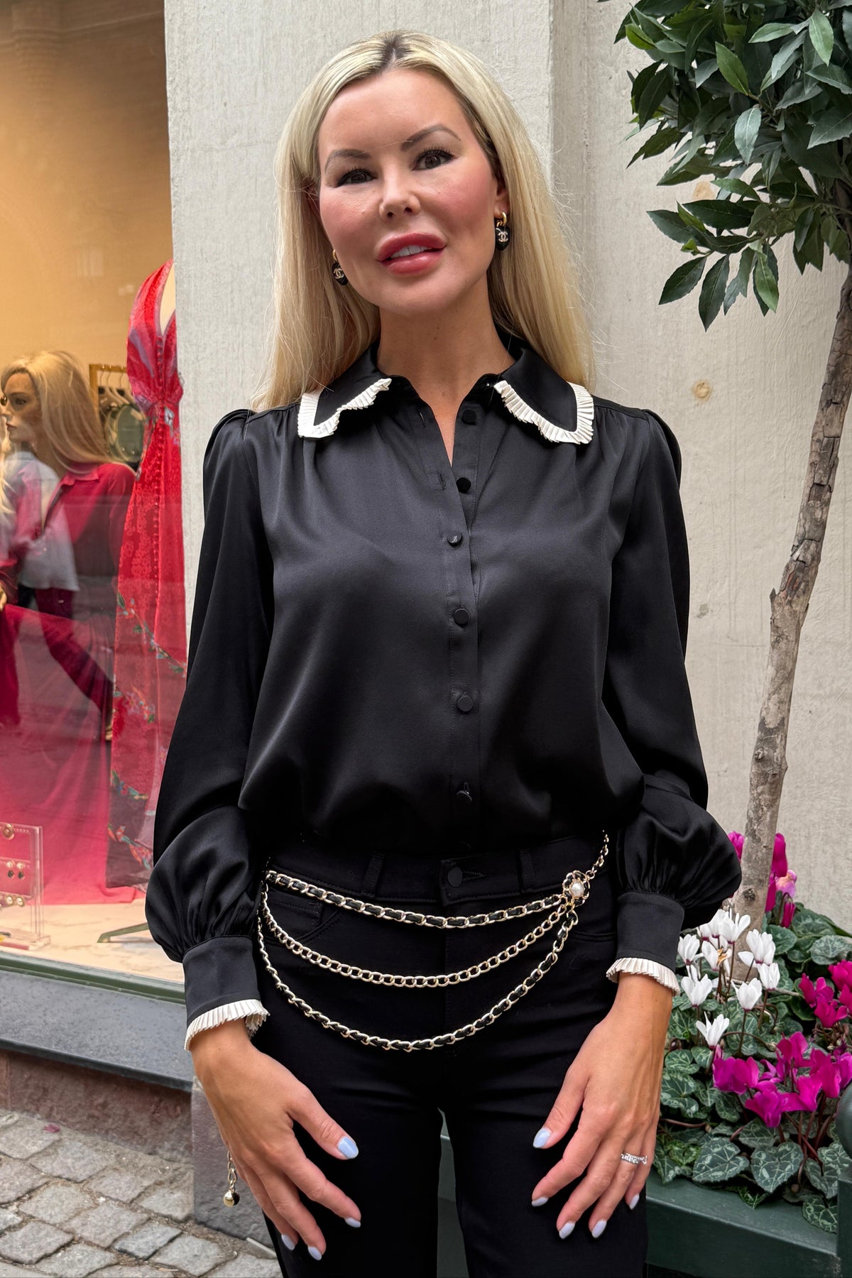 Tiny pleats in porcelain white run round the collar and cuffs of this black silk shirt creating a delicate and beautiful detail that elevates it into something special. The fit of the shirt is regular and it has full sleeves giving a relaxed air of elegance.