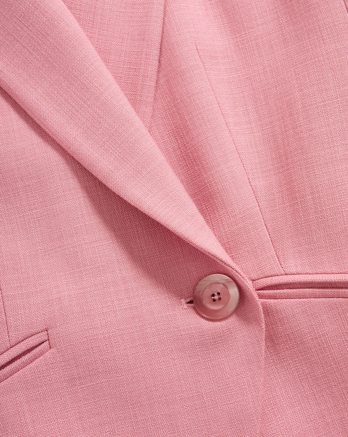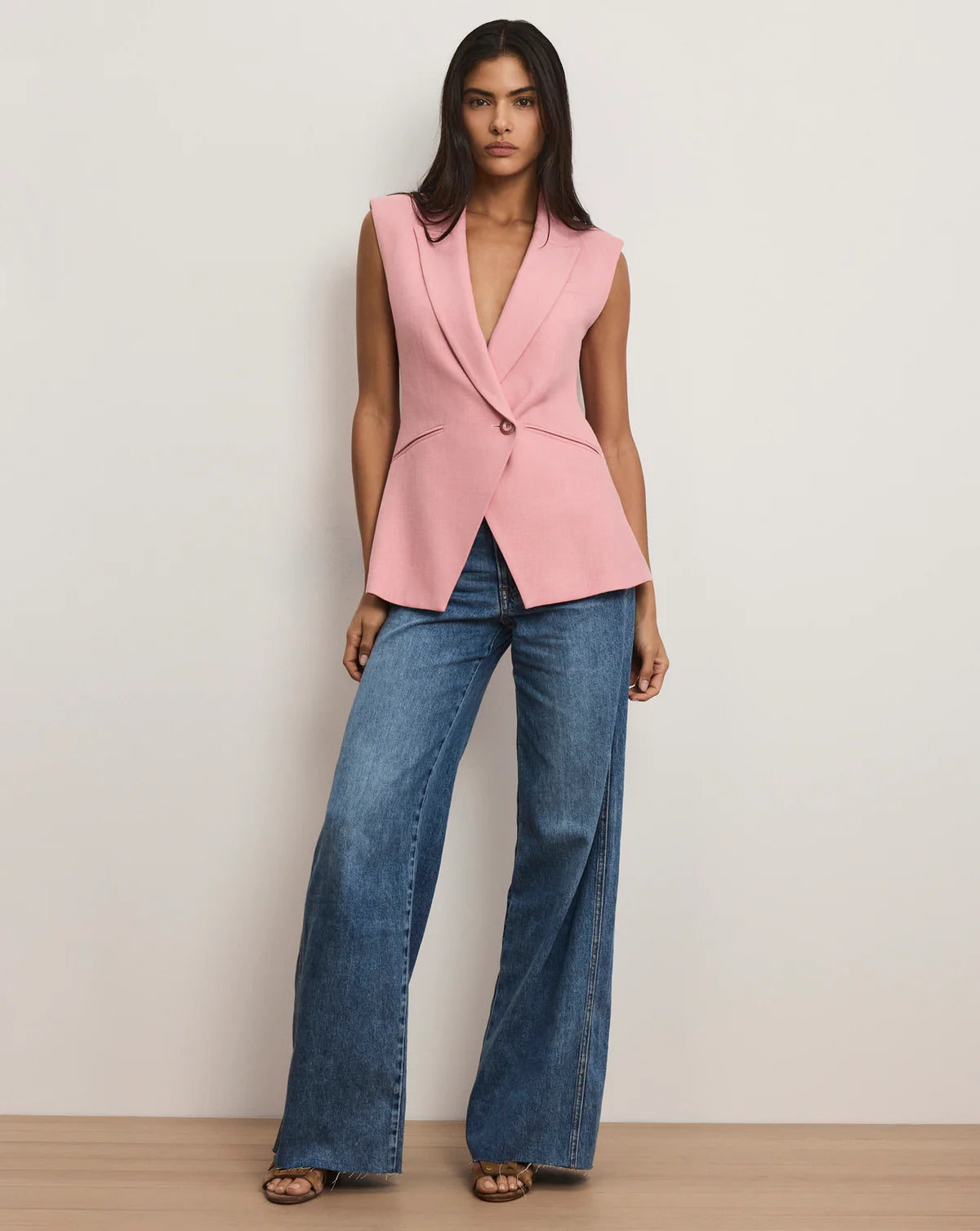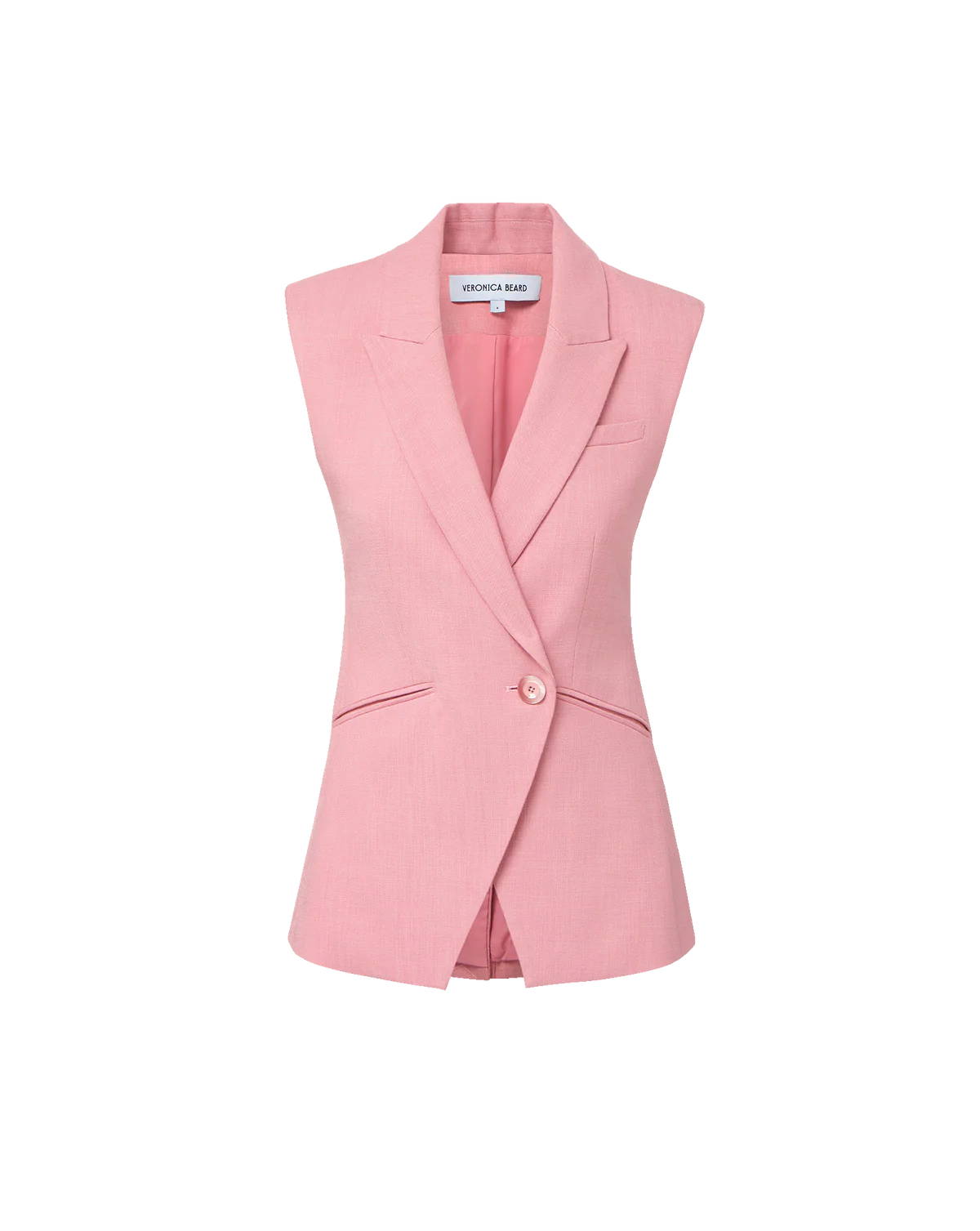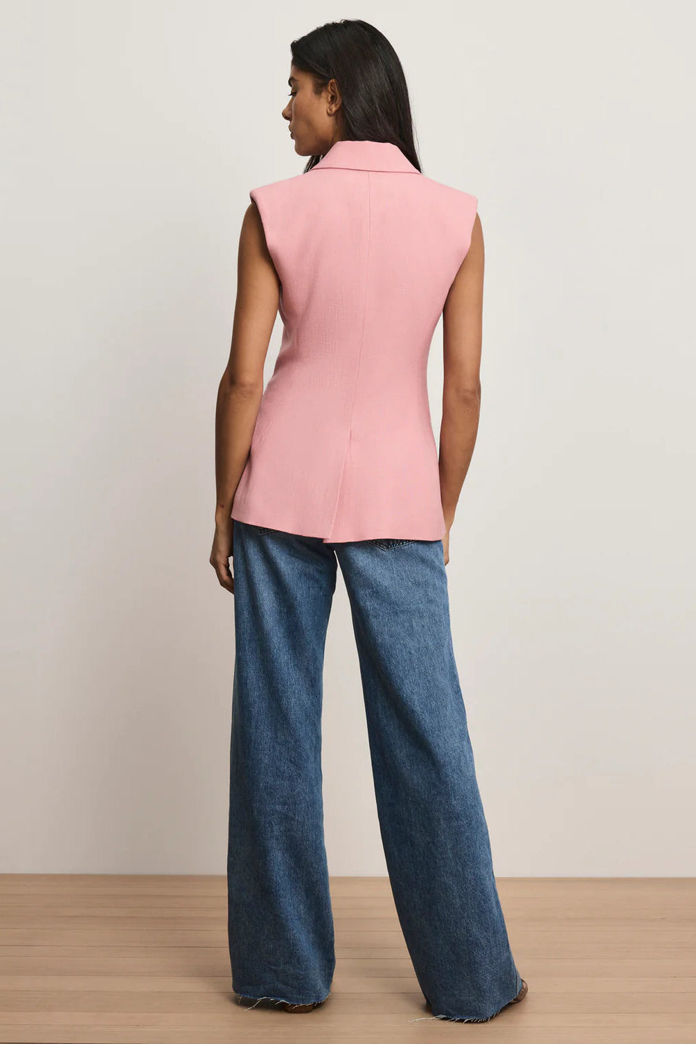 Expertly tailored from a premium stretch blend, the pink Ciel vest is a sleeveless version of a single-breasted blazer. It features thoughtful darting to cinch in the waist, along with clean seaming, angled welt pockets and a sharp lapel for a streamlined silhouette. Finished with a slub texture and the slightest sheen, it's a true wardrobe essential. Pair with the coordinating Marbeau pant for an outfit that's polished enough for the office and even chicer at night.