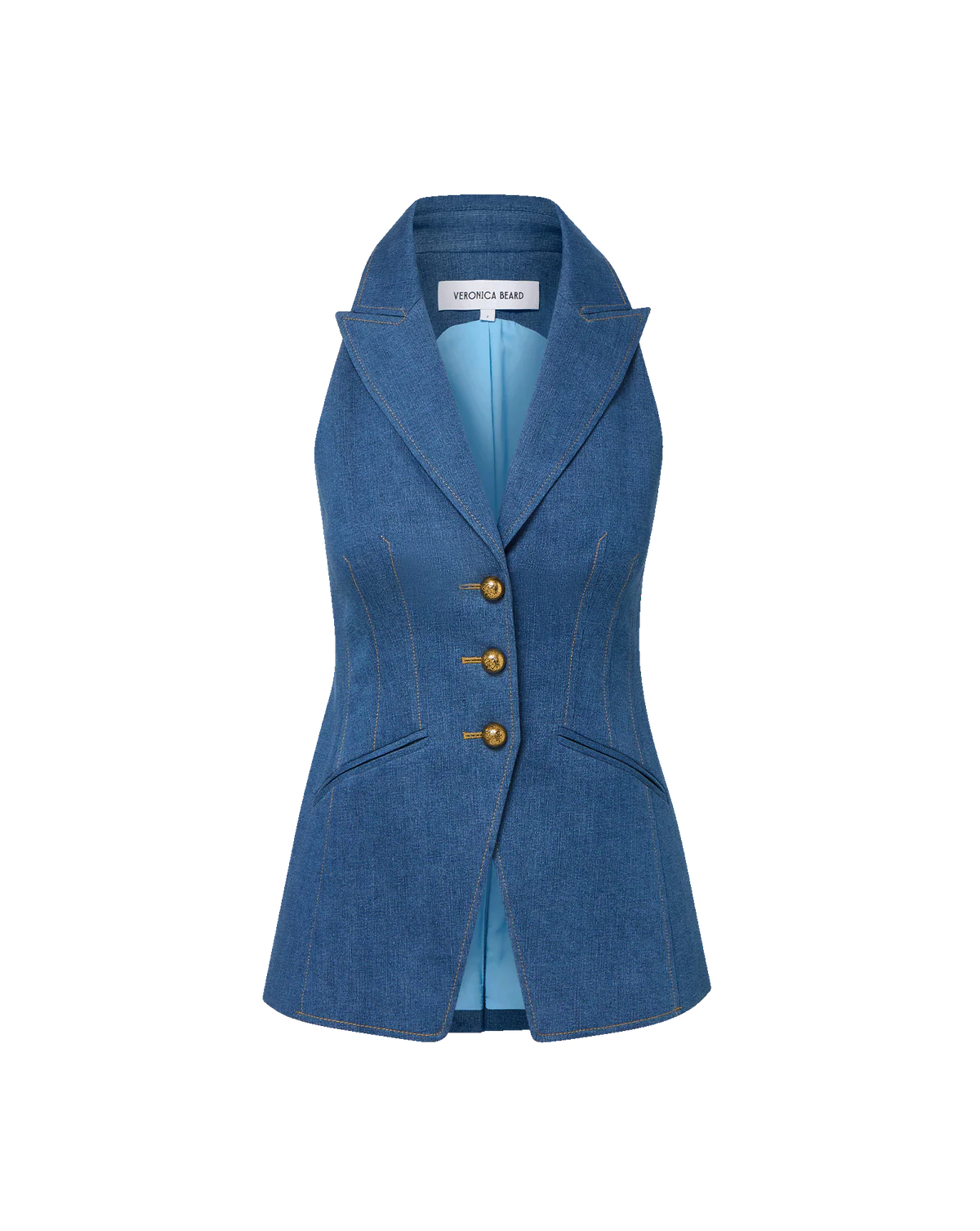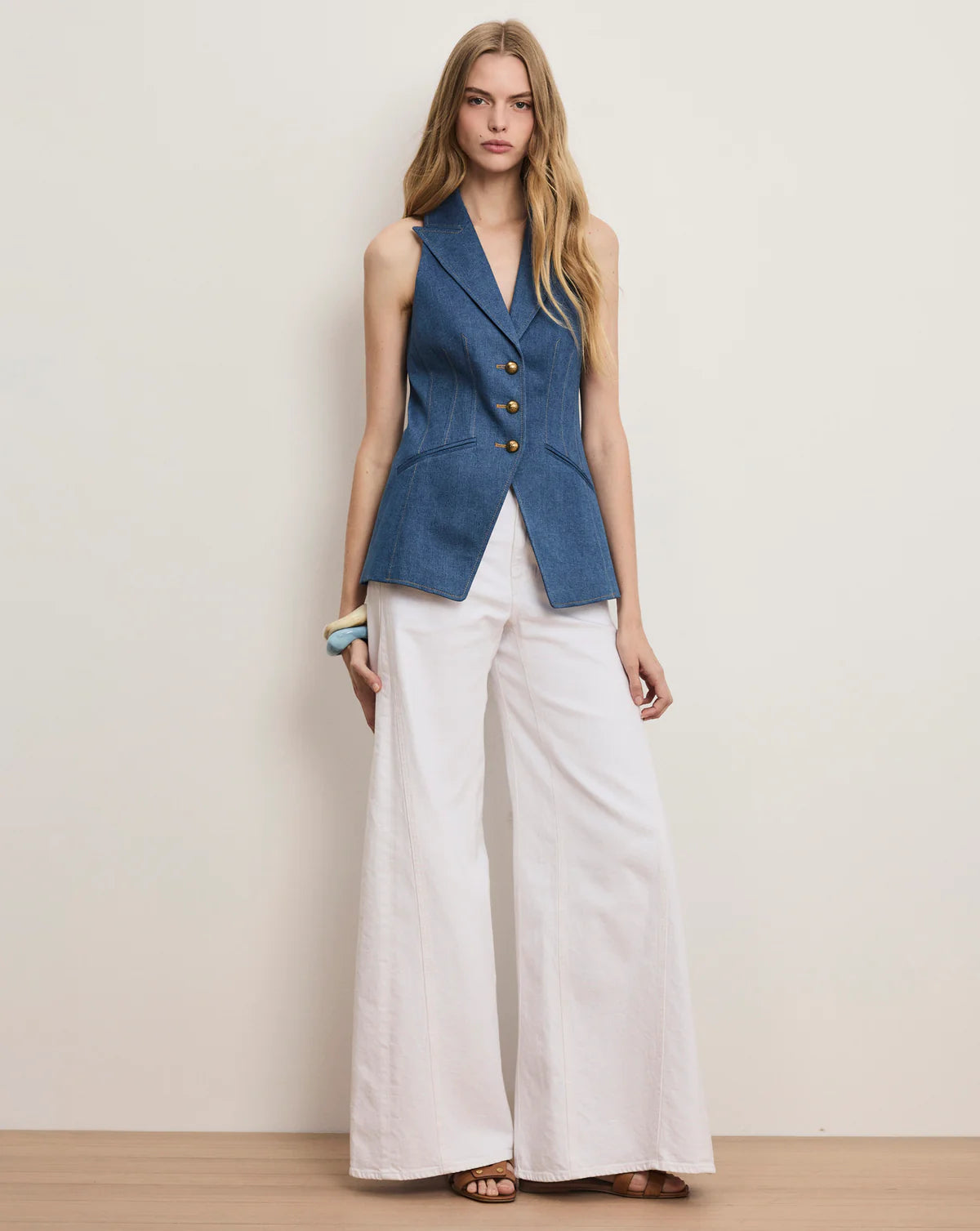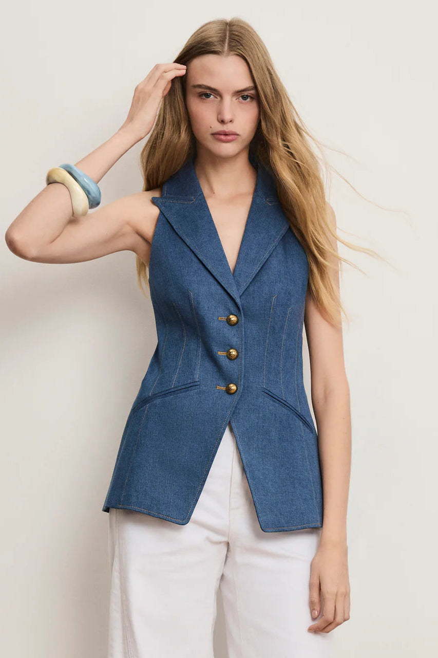 The ease of stretch denim, the polish of precision tailoring. The blue Costa vest is a slim, elongated silhouette with a wide peak lapel. Darting in the back cinches the waist while diagonal welt pockets underscore the clean lines and streamlined style. Wear it with the coordinating Frenkle pant for a modern spin on double denim.