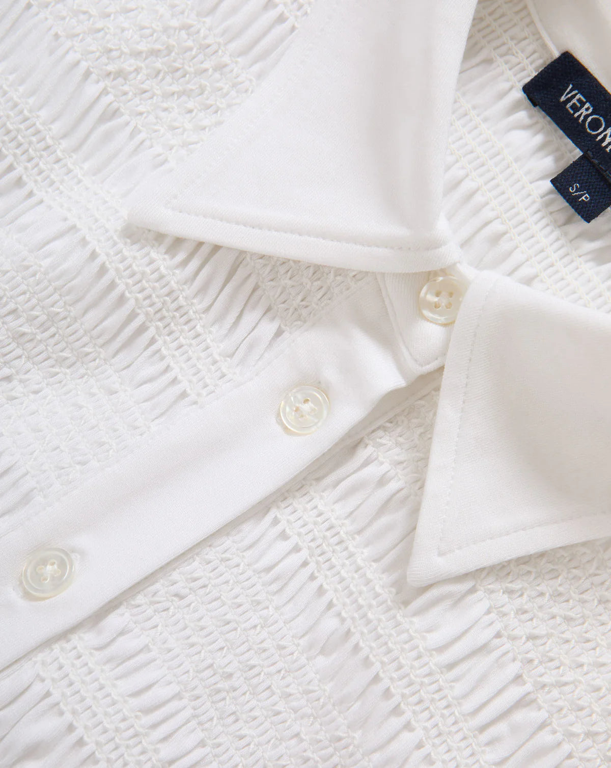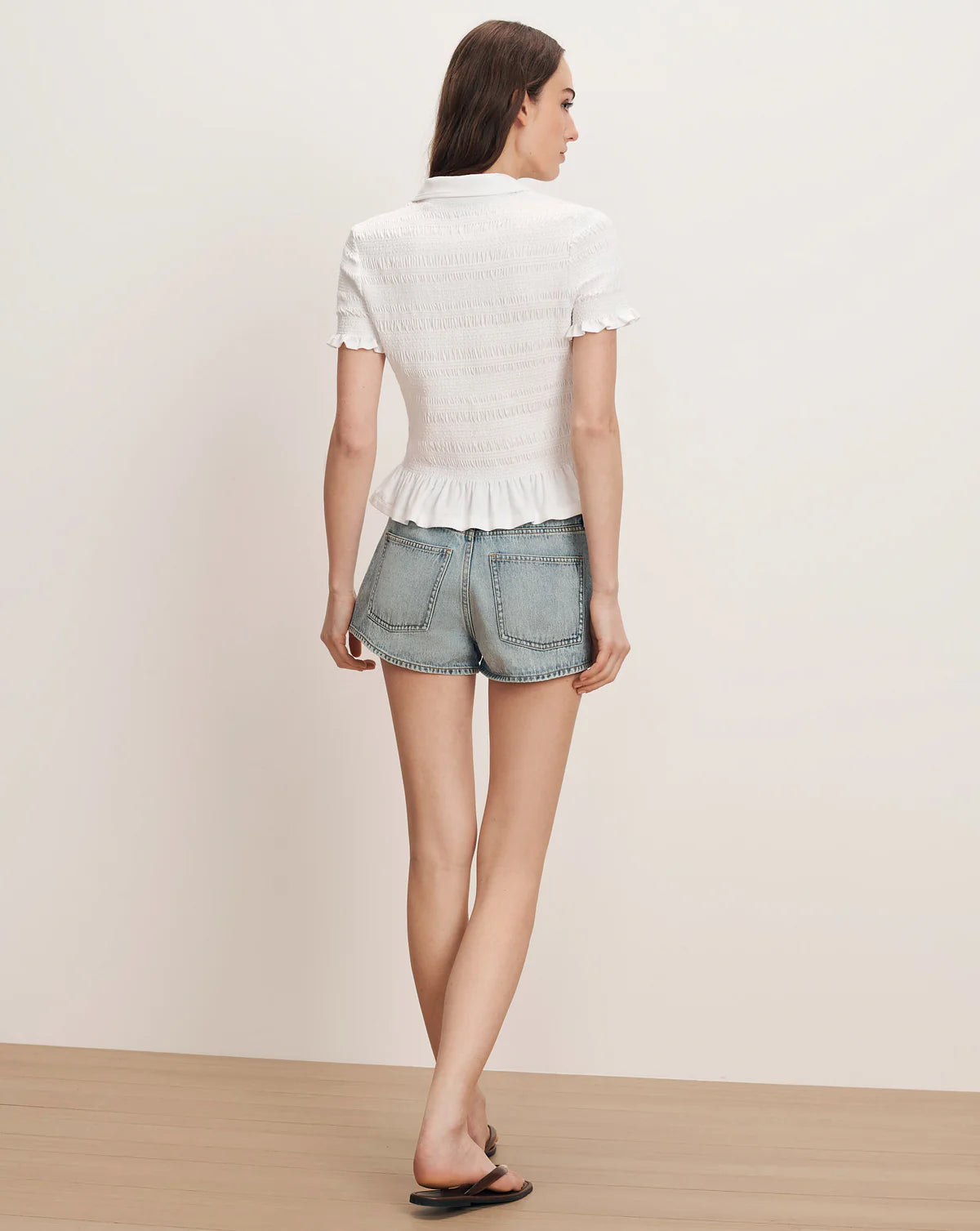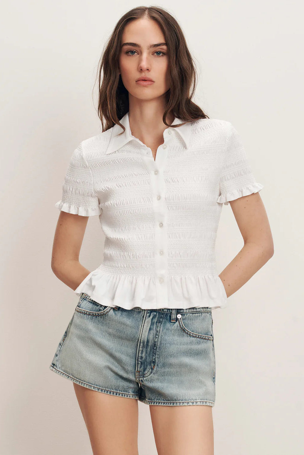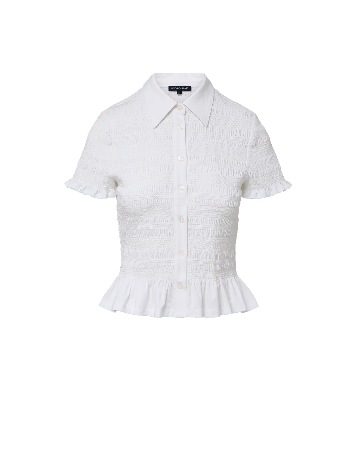 A feminine button-down top, designed with ease in mind. Crafted from soft stretch jersey in white, the Ellisandra top features a fully smocked, elasticated bodice for a comfortable slim fit and a ruffled hem that hits at the high hip. A point collar and short sleeves finished with subtle ruffle detail complete the look. Keep it casual with denim shorts, or dress it up with tailored trousers.
