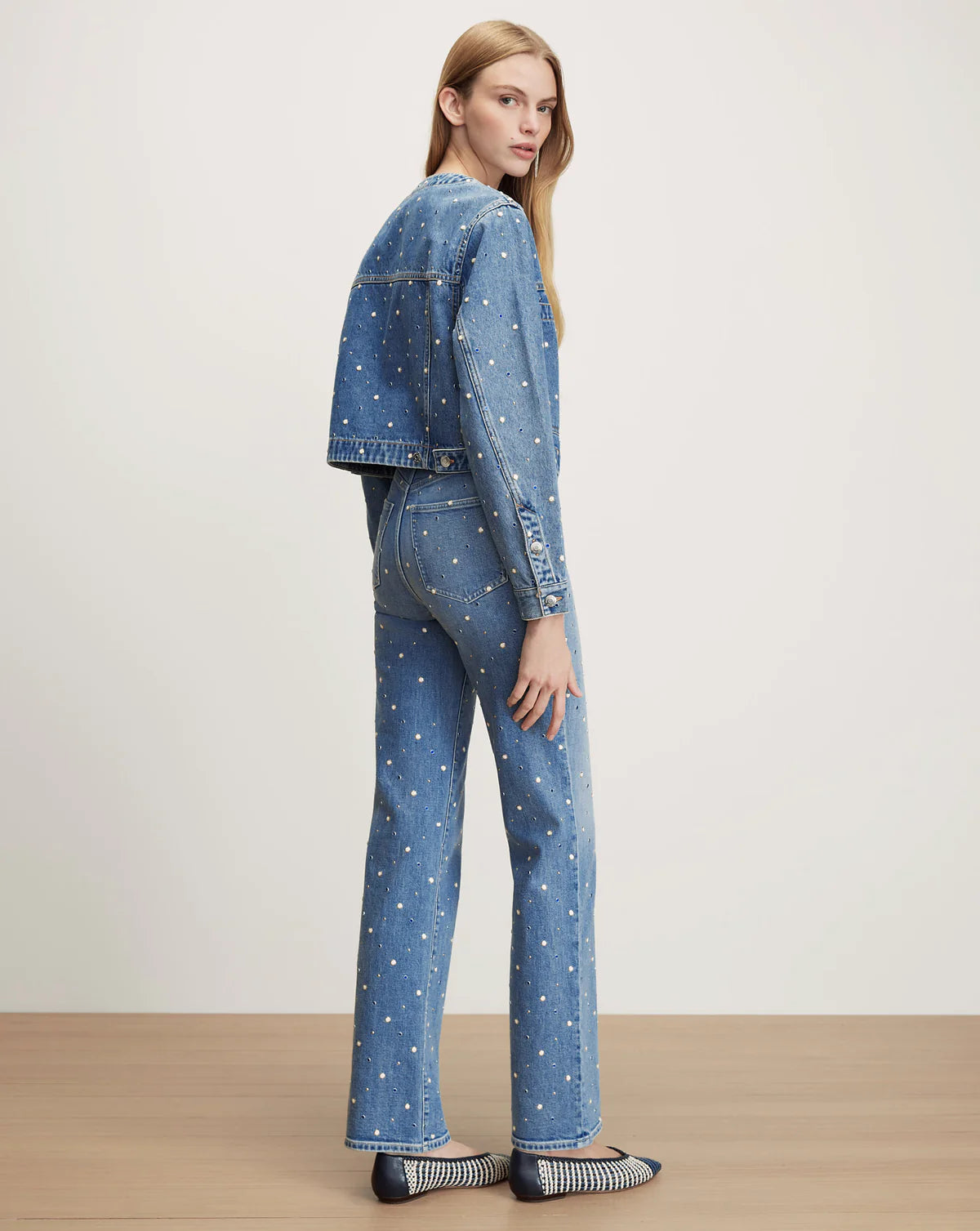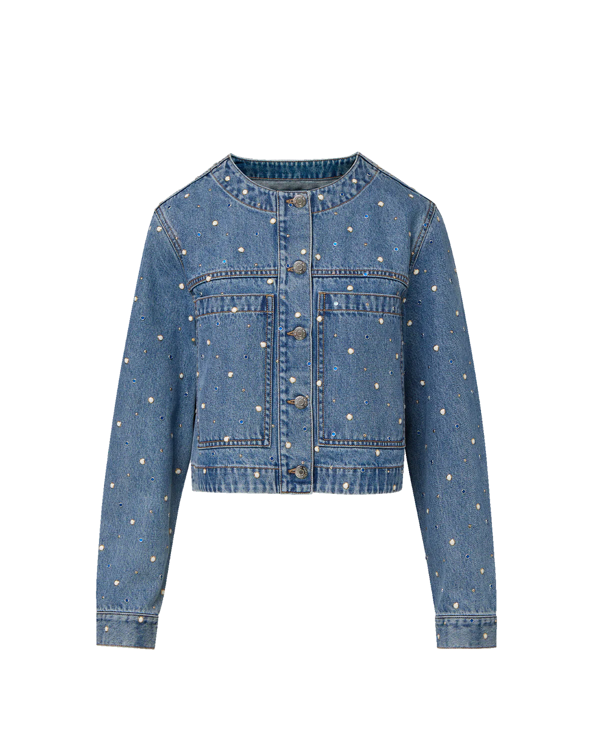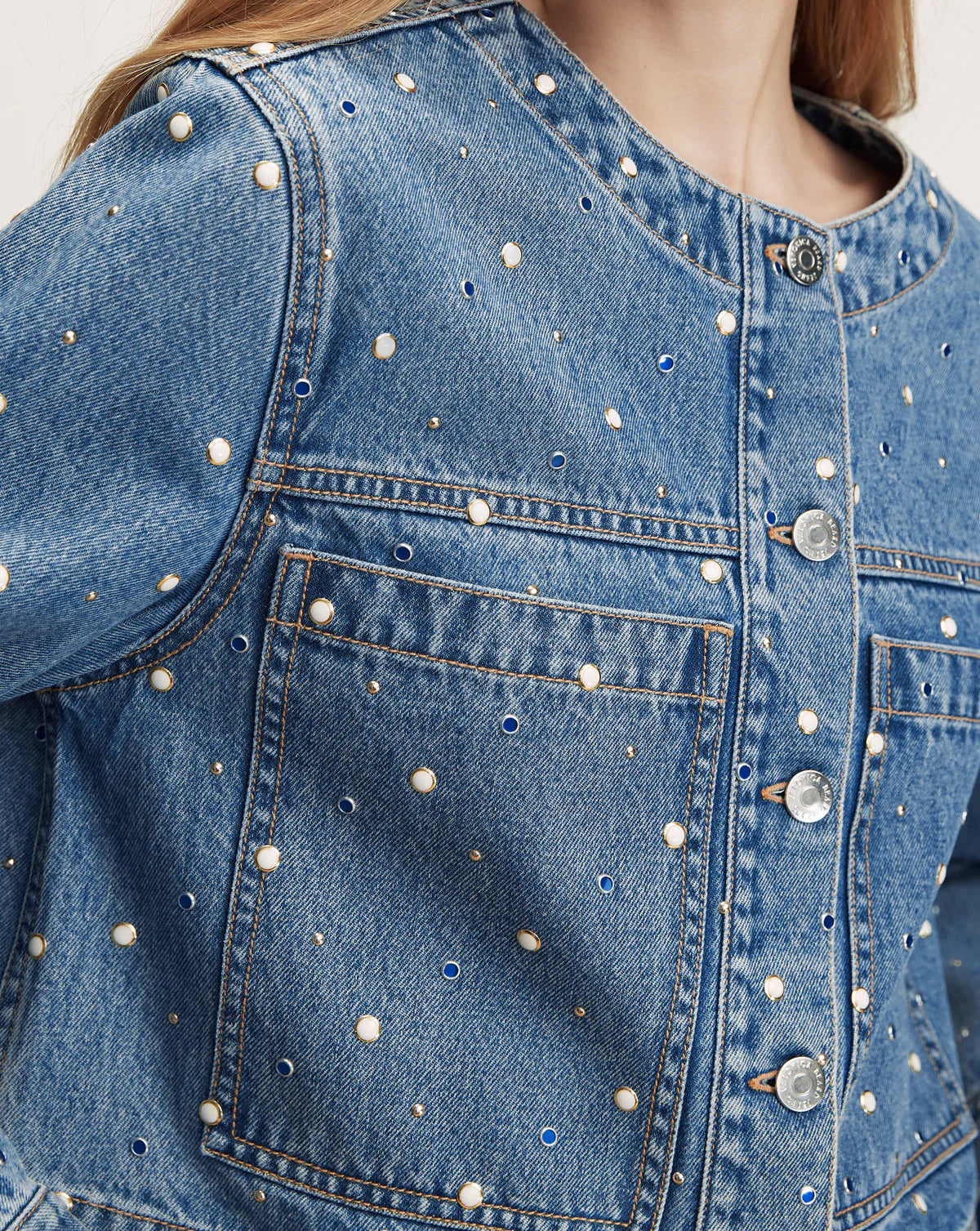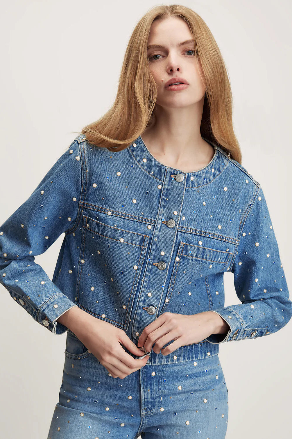 The denim jacket, with an eye-catching twist. Crafted from premium Japanese denim in a light-blue wash, the Lowry jacket features a cropped, collarless silhouette. Bezel-set studs are scattered throughout for a statement touch, while oversized slip pockets complete the look. For a bold take on double denim, pair it with the matching Dylan jeans, or style it with wide-leg trousers for a more polished feel.