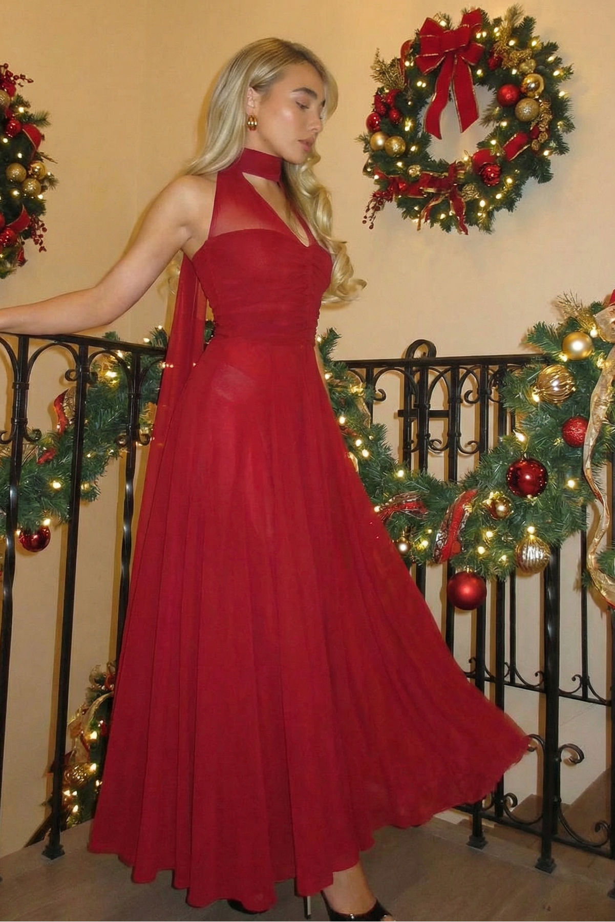 Lang kjole i stretch tyl med matchende kappe. V-udskæringen fremhæves af klapper, der leger med krydser på overdelen og knude bagpå. Silhuetten er tætsiddende ved taljen, mens den åbner blødt og med vidde på skørtet