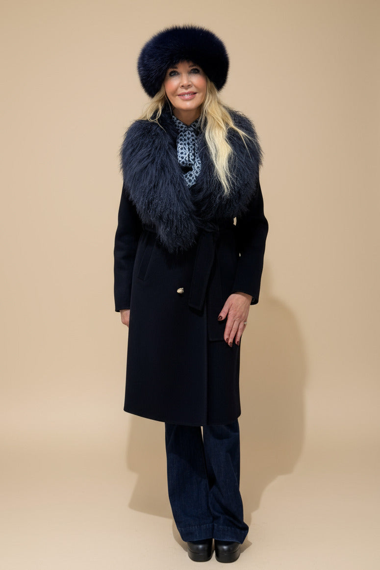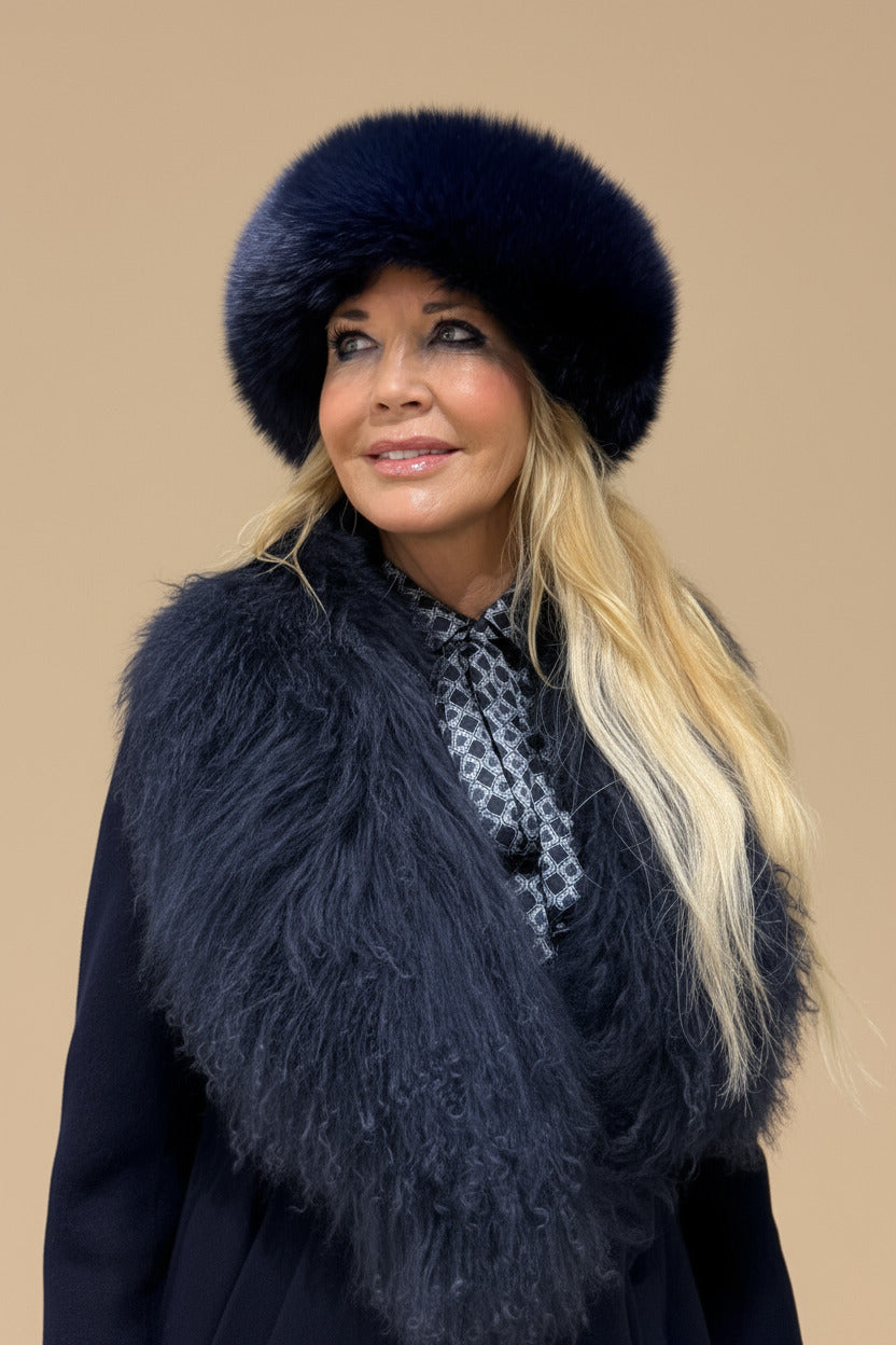 Blue wool and cashmere blend hat with fox fur trim. Soft, smooth, close-fitting crown. Comfortable fit.