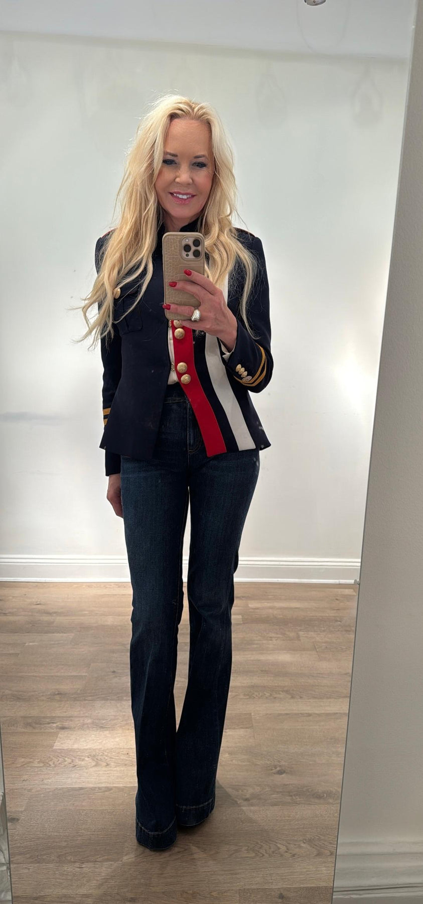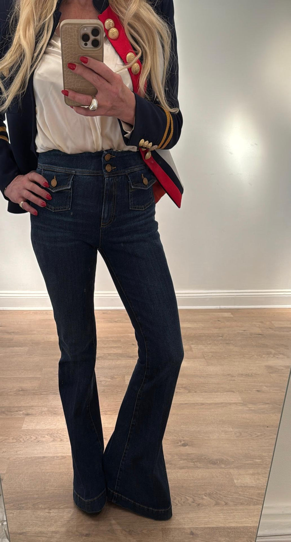 Emi jeans for women from Seafarer in dark blue. The model has a fashionable look thanks to the flared cut and classic details in a fashionable look, while the otherwise otherwise slim fit creates a feminine silhouette.