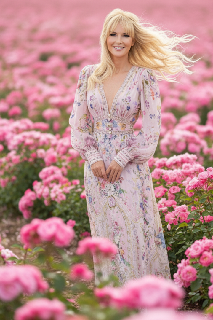 The Palatial Pastels Shaped Waistband Dress With Gathered Sleeves is a handcrafted silhouette designed by our in house artisans. Reimagined in an exclusive limited edition print, our shaped waistband dress features a V neckline, framed by a front button fastening that meets a shirred back for adjustable comfort. Its soft, gathered sleeves cascade beside the form, adding fluidity with every step, its finished with delicate frills and intricately placed crystal embellishments for romantic allure.