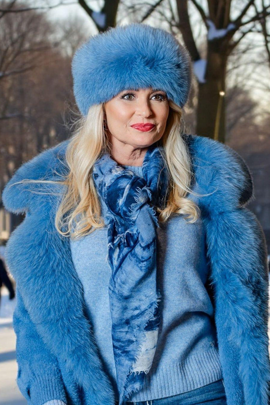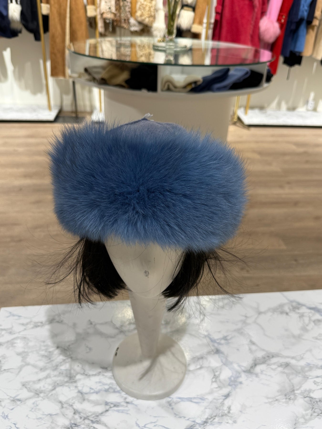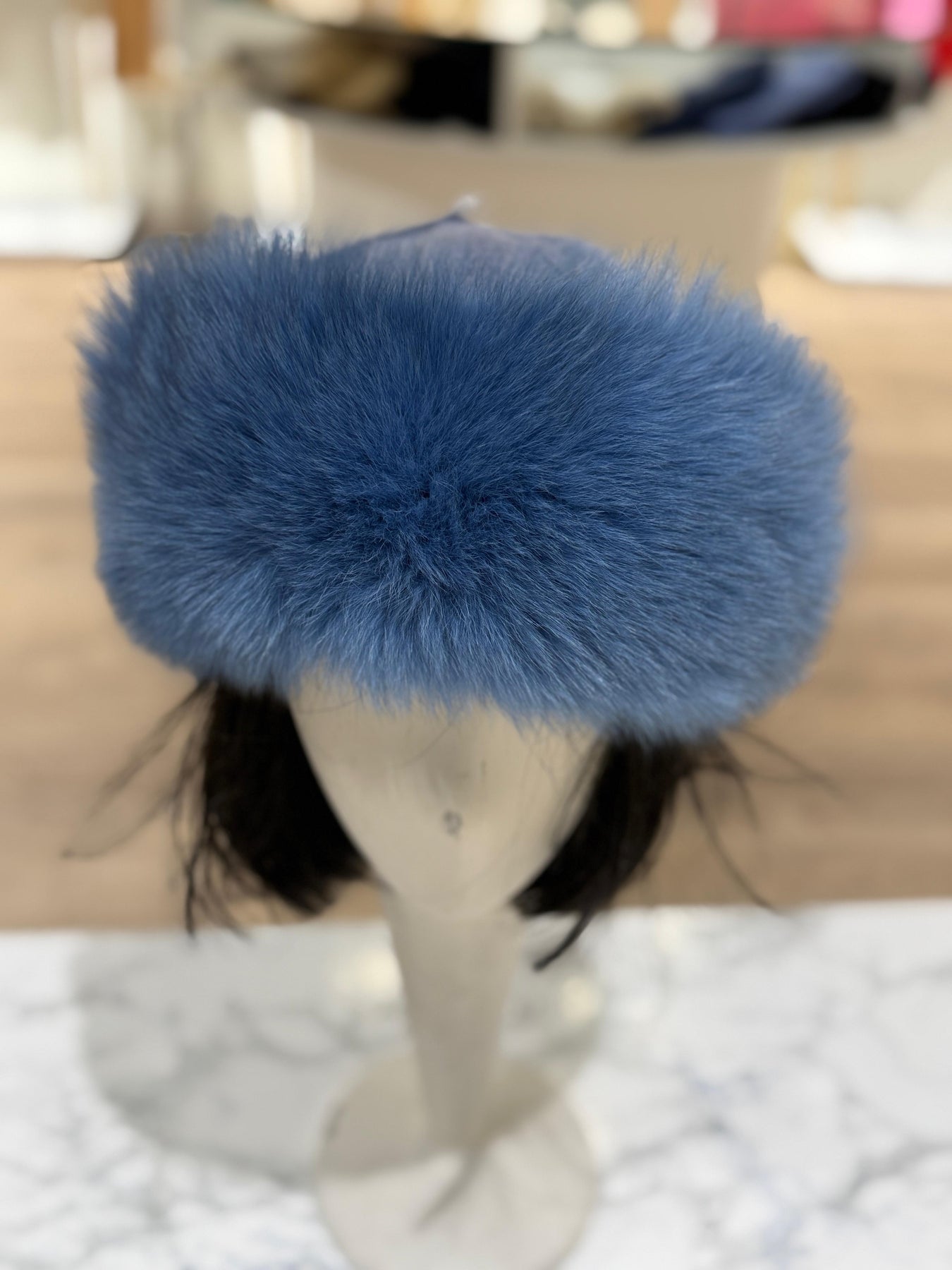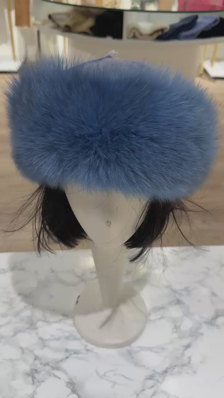 Blue wool and cashmere blend hat with fox fur trim. Soft, smooth, close-fitting crown. Comfortable fit.
