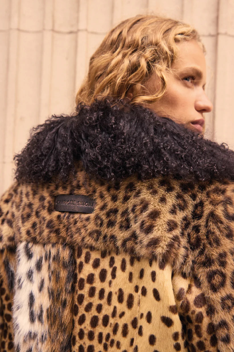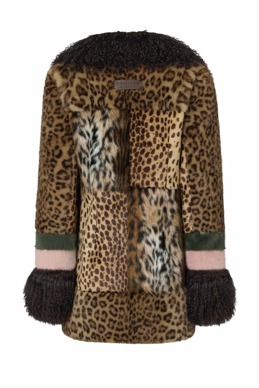 Melody is playfully bold. Crafted in faux fur with Mongolian trims, its mix of leopard, khaki, rose, and chocolate tones feels both electric and luxurious. A true showstopper for layering with personality.