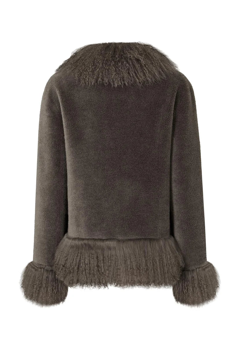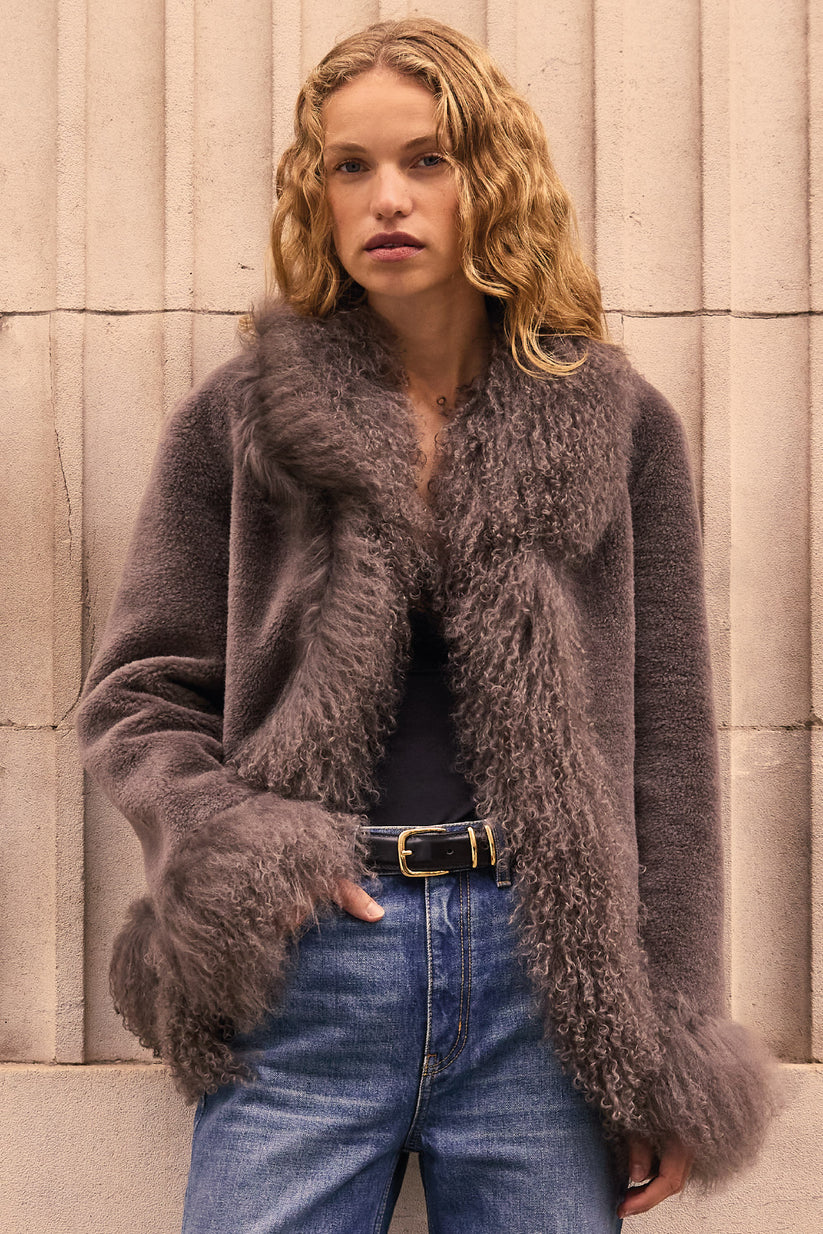 Our signature style is back! Fashioned from faux shearling and Mongolian trims, this jacket feels both textured and luxurious. Cropped at the waist for a flattering fit, Olive's relaxed silhouette and minky grey shade make her easy to pair with everyday basics.