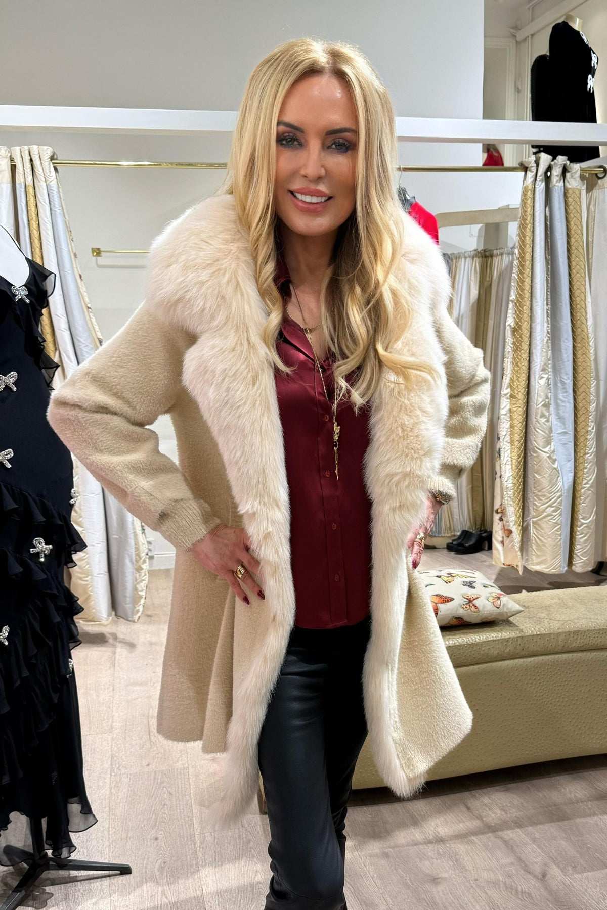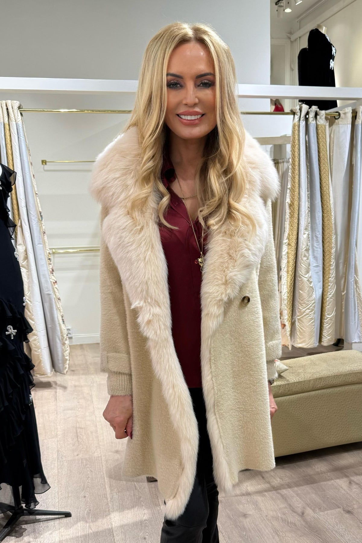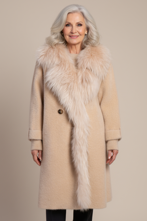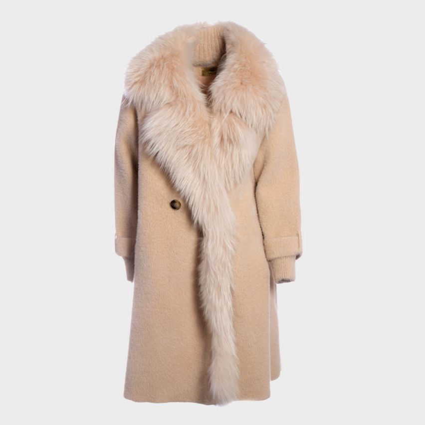Coat with large Fox fur collar. It has pockets and closes with 2 buttons. Comfortable, abundant fit, it is recommended to order one size less; medium length (arrives above the knee). This garment is also available in the variant in ecological fur, or without fur: contact us for more info and any requests.