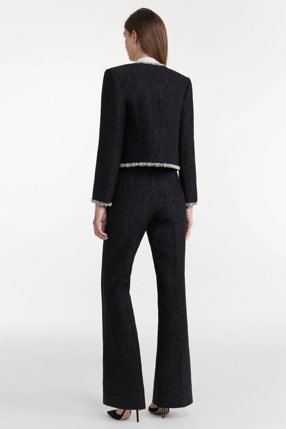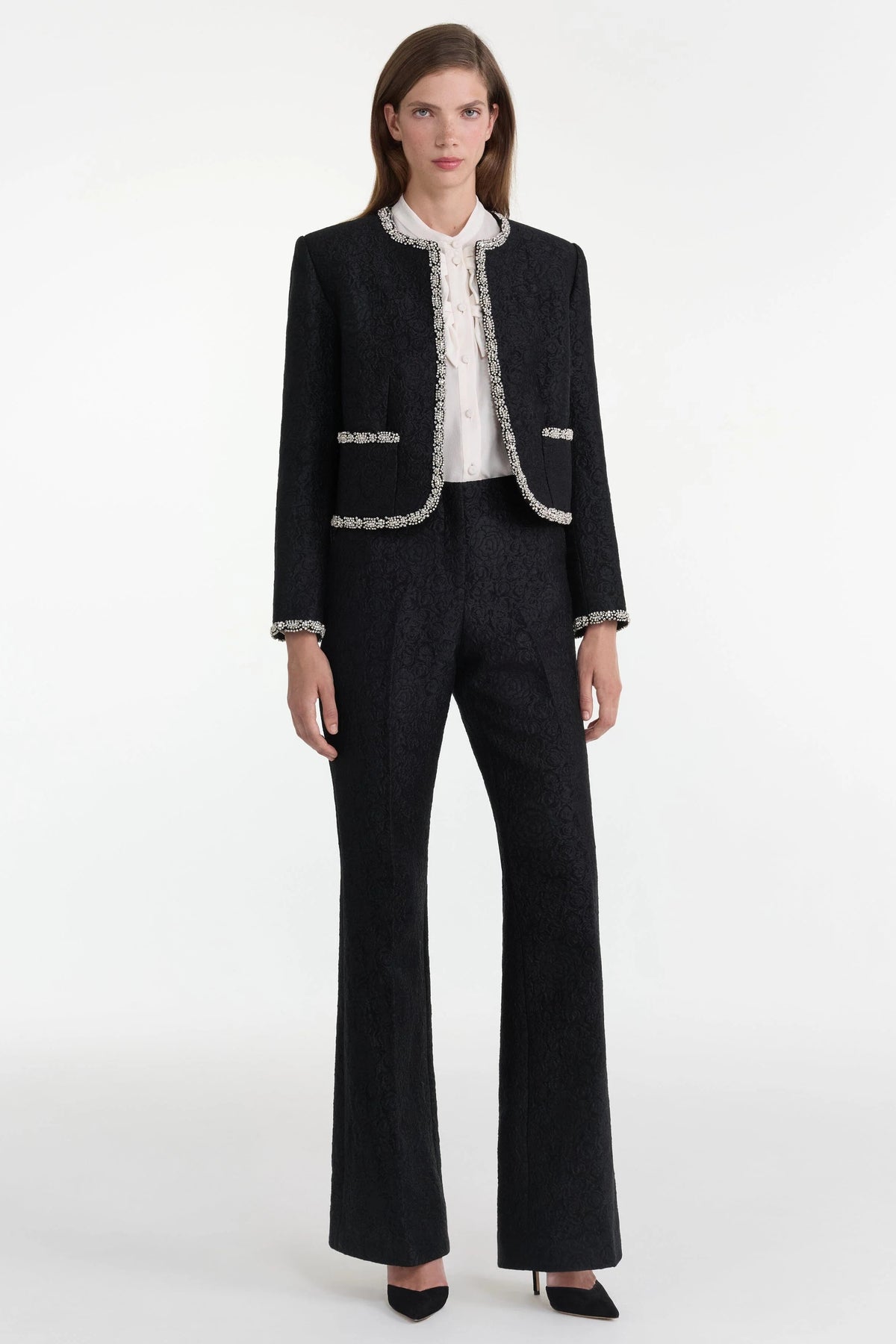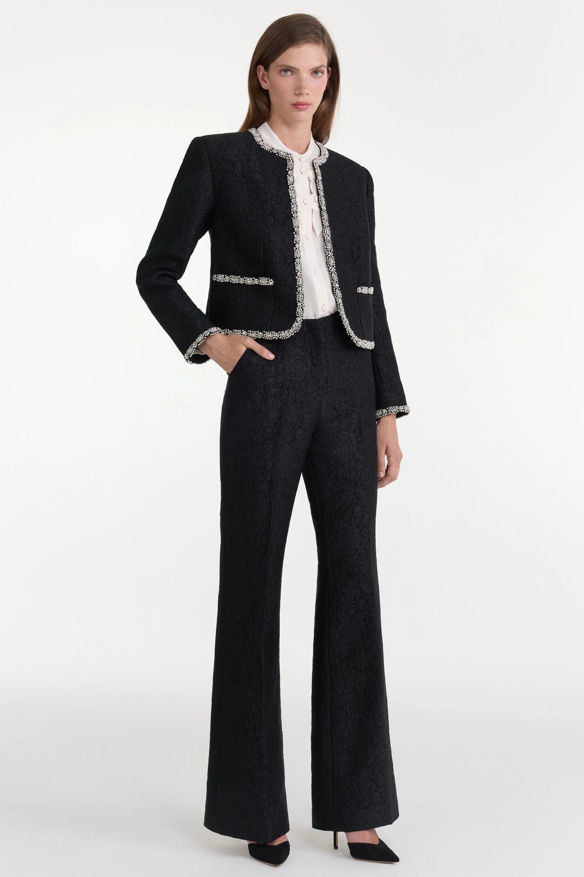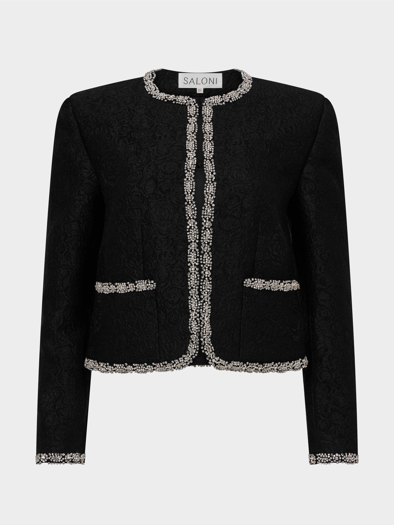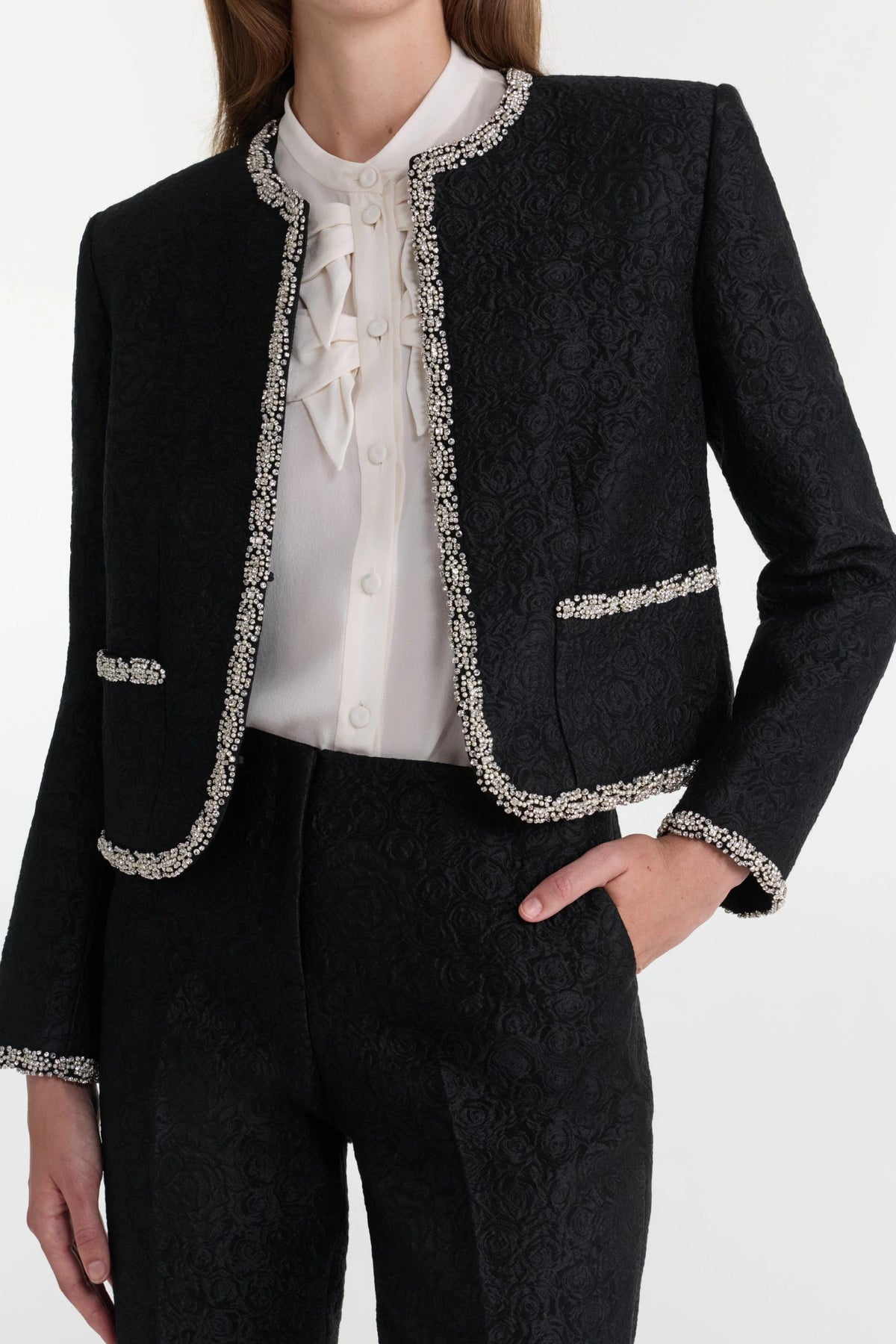 The Luma Jacket combines refined tailoring with feminine sophistication. Cut in a rich brocade with a woven rose pattern, it features intricate crystalline embroidery that accentuates the jacket’s lines. The embroidery is embellished with glass beads and shimmering crystals. This is the perfect addition to any wardrobe, easy to layer over a shirt and trousers or dress and elevates an outfit for any occasion.