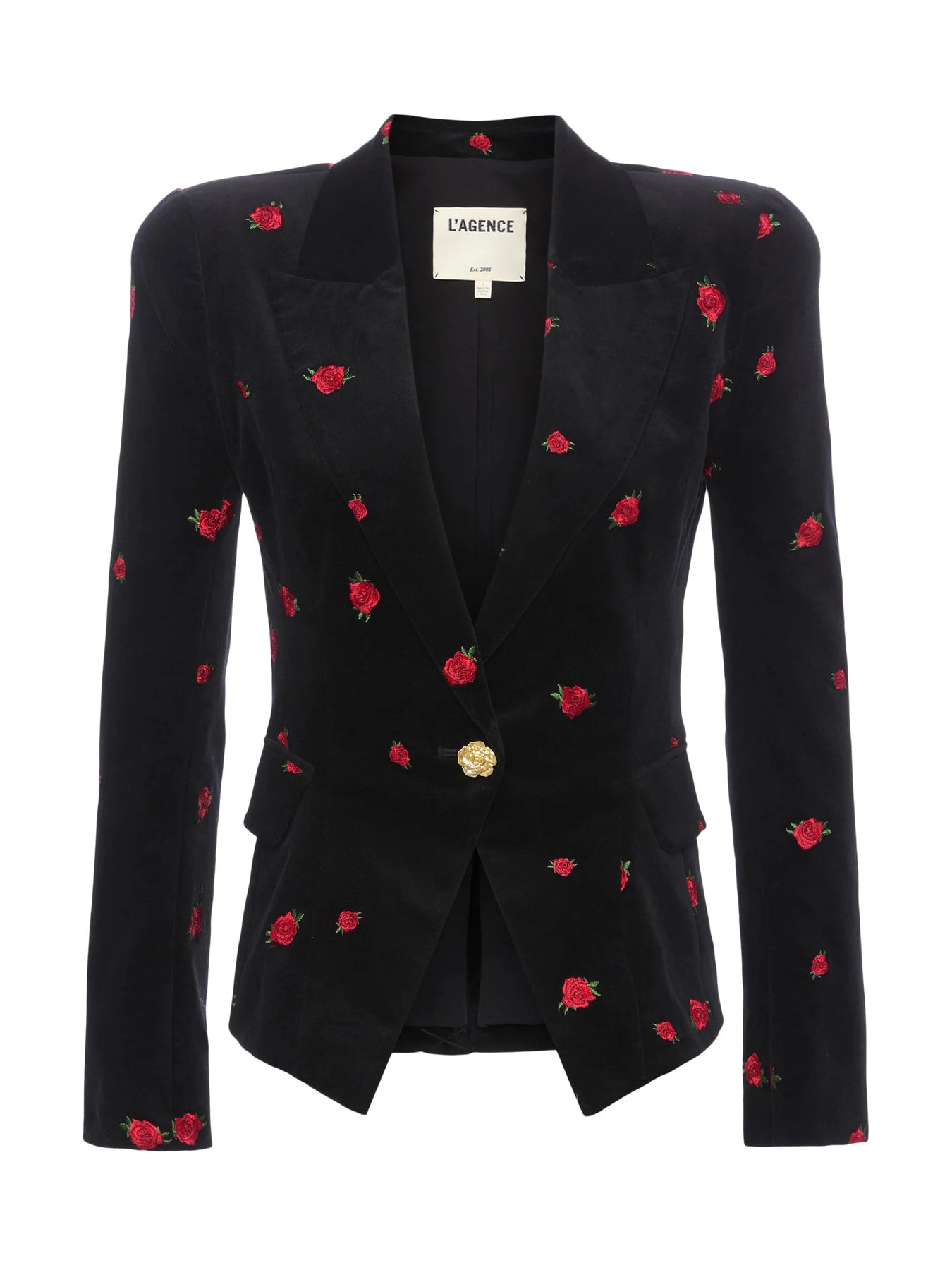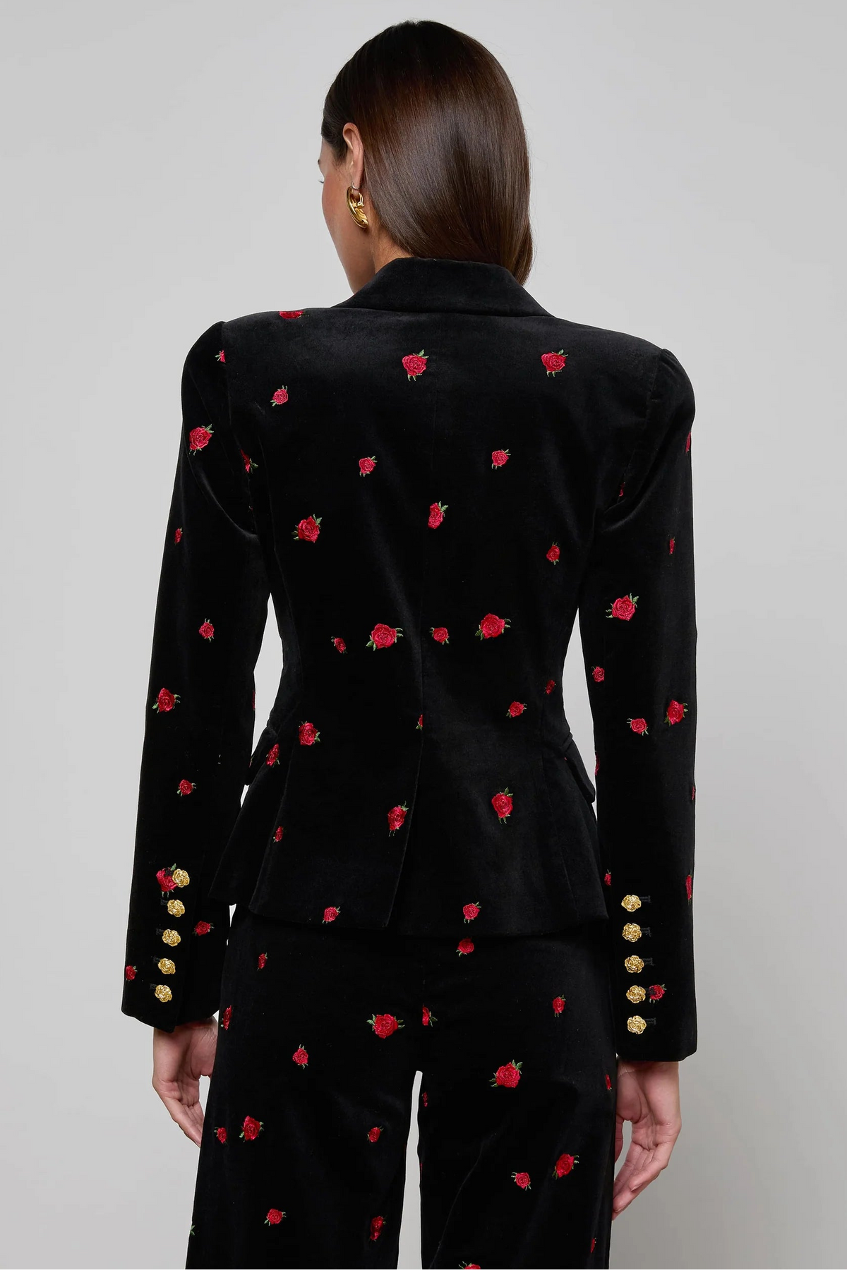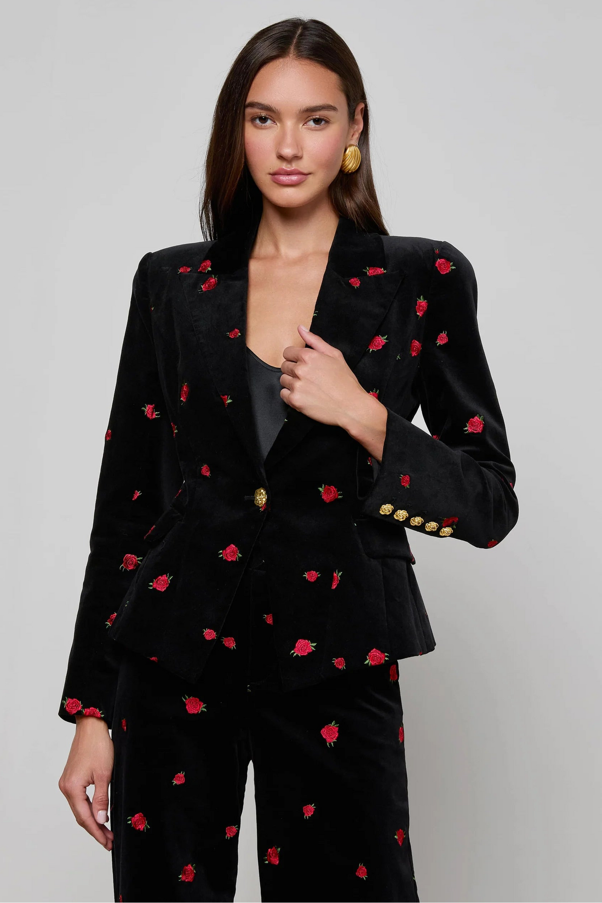 The Kaisley gets a romantic twist in this luxe black velvet edition, embroidered all over with delicate red roses. The sleek, tailored cut keeps the silhouette sharp and feminine, while the gold floral button adds a touch of elegance. Bold yet refined, it's the perfect statement layer for nights out.