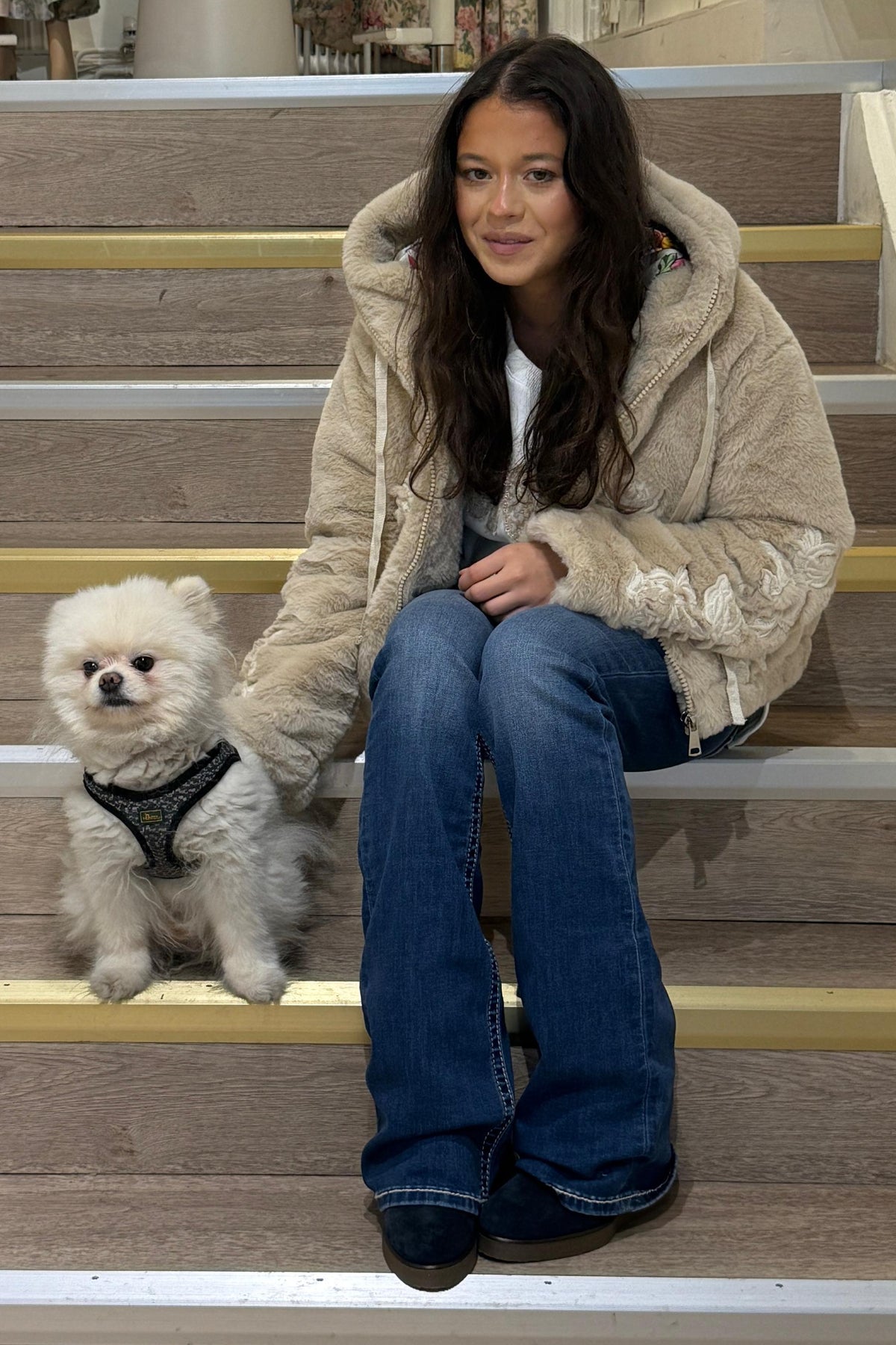 Faux fur hooded short jacket with Embroidery all around
