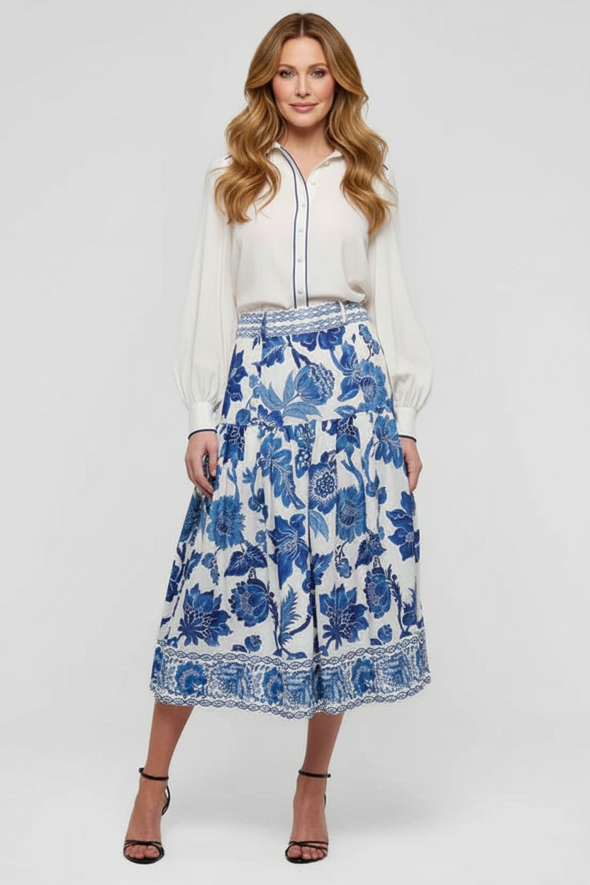 Fitted at the hip before flaring out into a deep flounce, this beautiful linen skirt is feminine and stylish. The bold print of blue flowers is thrown into relief with a contrast border and waistband whilst belt loops keep it casual.