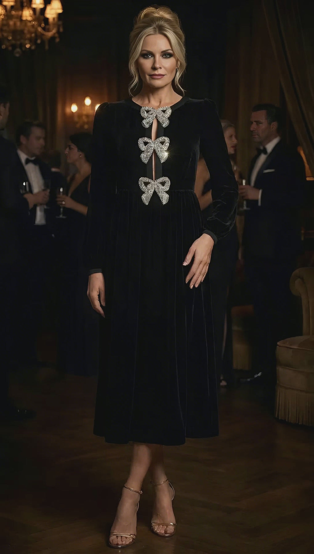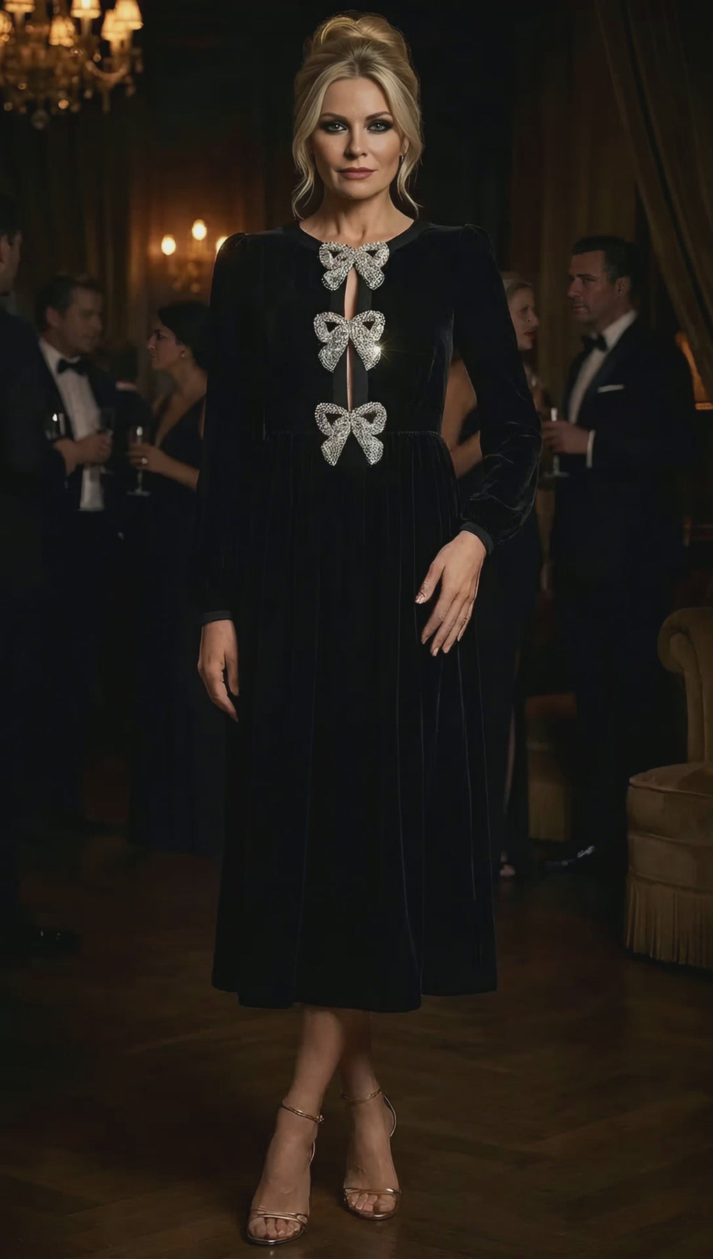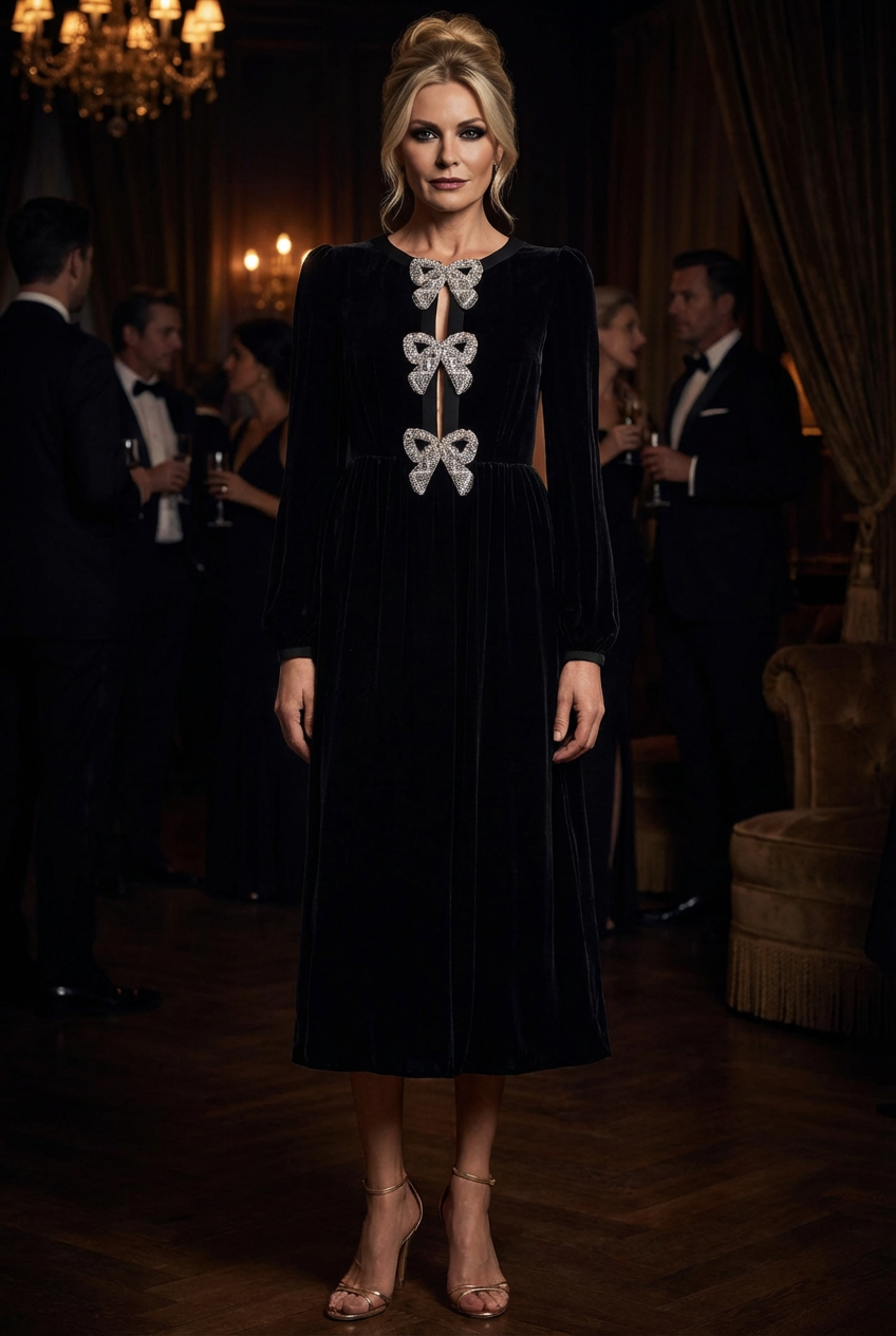 Our Camille dress is re-imagined in luxurious liquid velvet, adorned with jeweled bows in silver crystal and pearl. Designed with a gathered waist that flows into a graceful skirt, it radiates evening elegance. Pair it with heels and an evening bag for an unforgettable, show-stopping look.