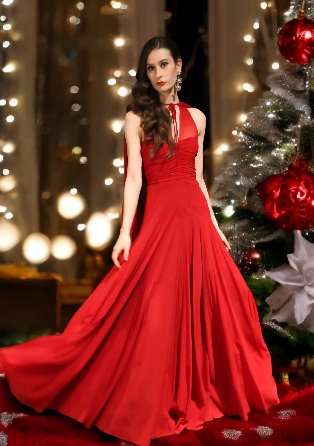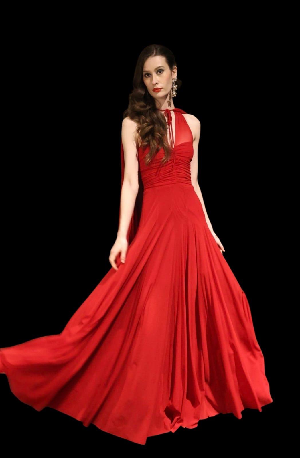Long dress in stretch tulle with matching cape. The V-neckline is emphasized by flaps that play with crosses on the bodice and knot on the back. The silhouette is fitted at the waist, while it opens softly and with a flare on the skirt