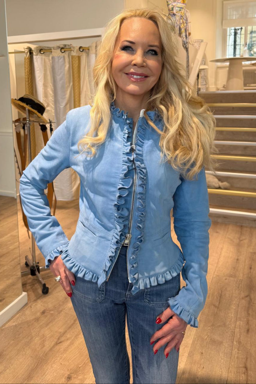 RUFUS NAVAJO SUEDE  FITTED JACKET WITH RUFFLE TRIM SKY BLUE