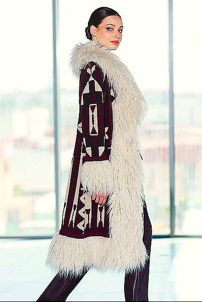 The ODETA MAROON ALPACA LONG COAT is a symphony of textures and colors, a masterpiece that transcends convention. Crafted from the nobility of alpaca, its double-faced, tri-color ethnic jacquard is a bold design statement, enhanced by an innovative, curly synthetic fur that simulates the texture of a wild goat. This unique combination lends unparalleled visual and tactile depth and richness. This maroon jacquard long coat is not just an outerwear piece; it's an invitation to boldness. Each Odeta maroon long coat is conceived to envelop you in a narrative of luxury and self-expression, projecting an unmistakable presence and a style that defies expectations with innate confidence.