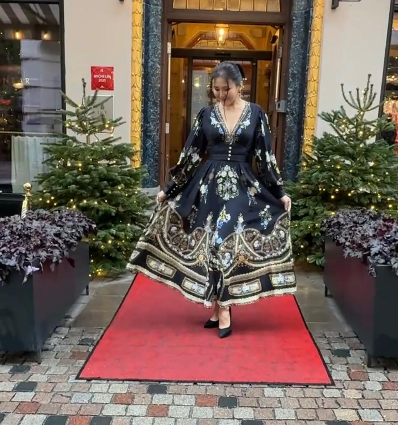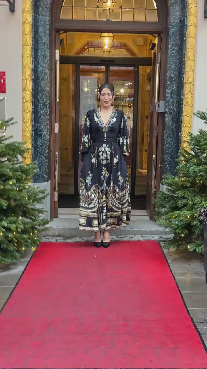 Ottoman Elegance-klänningen med formad midjeband och rynkade ärmar är en handgjord silkessiluett designad av våra egna hantverkare. Omformad i ett exklusivt begränsat upplaga-tryck, är vår klänning med formad midjeband inramad med en smickrande V-ringning och rynkad rygg för justerbar komfort. Mjukt rynkade ärmar faller med delikata volanger, vilket tillför flöde, form och en touch av romantik till varje rörelse.