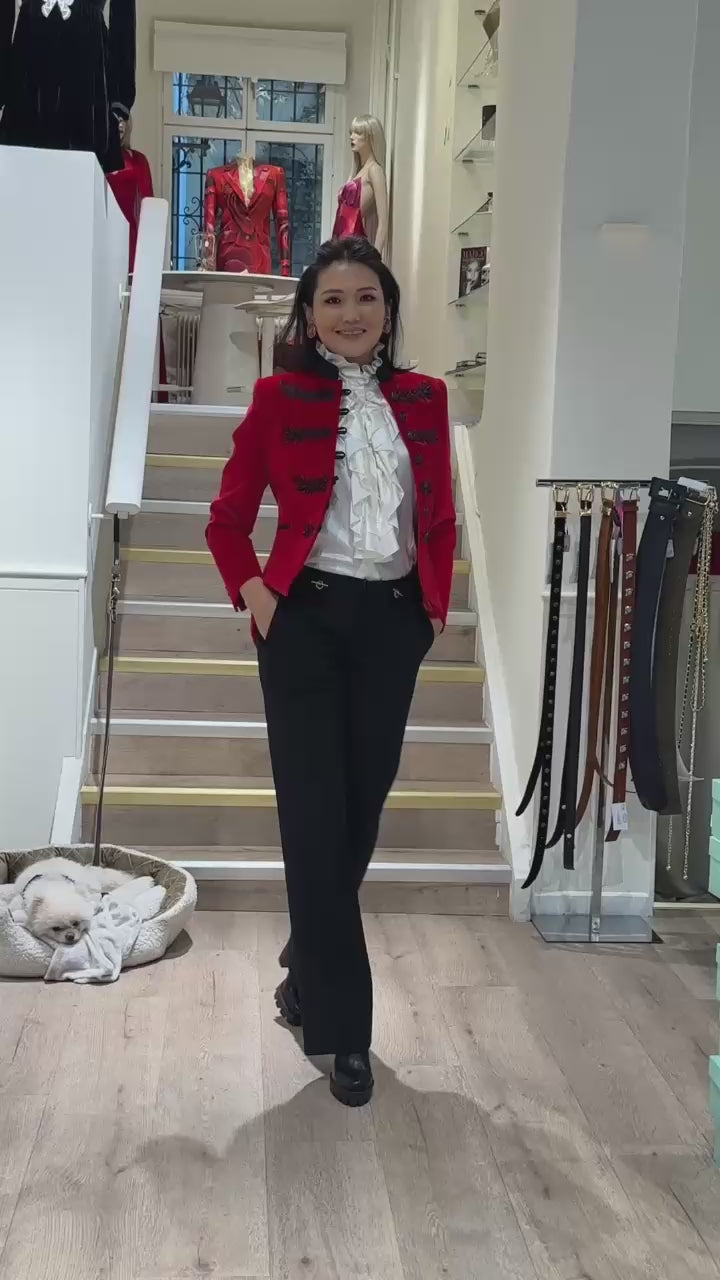 The RENATA VELVET RED BLAZER is more than fashion—it’s a statement of style and awareness. This exquisite red velvet tailcoat, crafted with our brand’s iconic pattern, ensures a flawless fit that enhances the feminine silhouette with timeless sophistication.