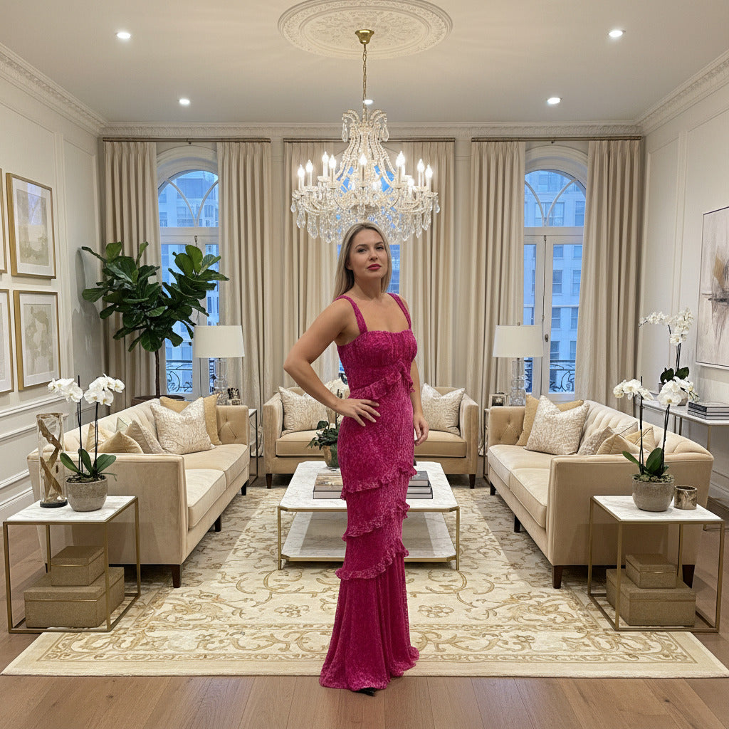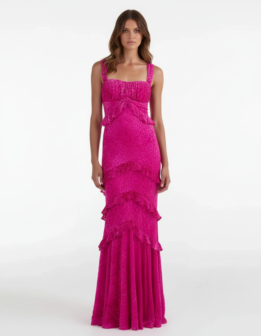 The statuesque Chandra Dress is a maxi-length gown featuring special details, including a square neckline, an elegant low back, and a romantic tiered ruffle skirt. The velvet devore, with its sumptuous texture, accentuates the bold orchid hue, creating a striking effect.