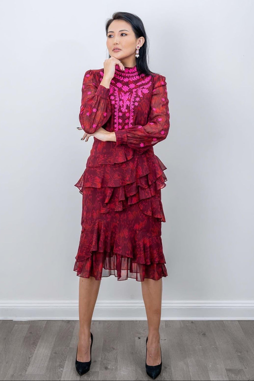 SALONI ISA RUFFLE SILK BURGUNDY EMBROIDERY DRESS